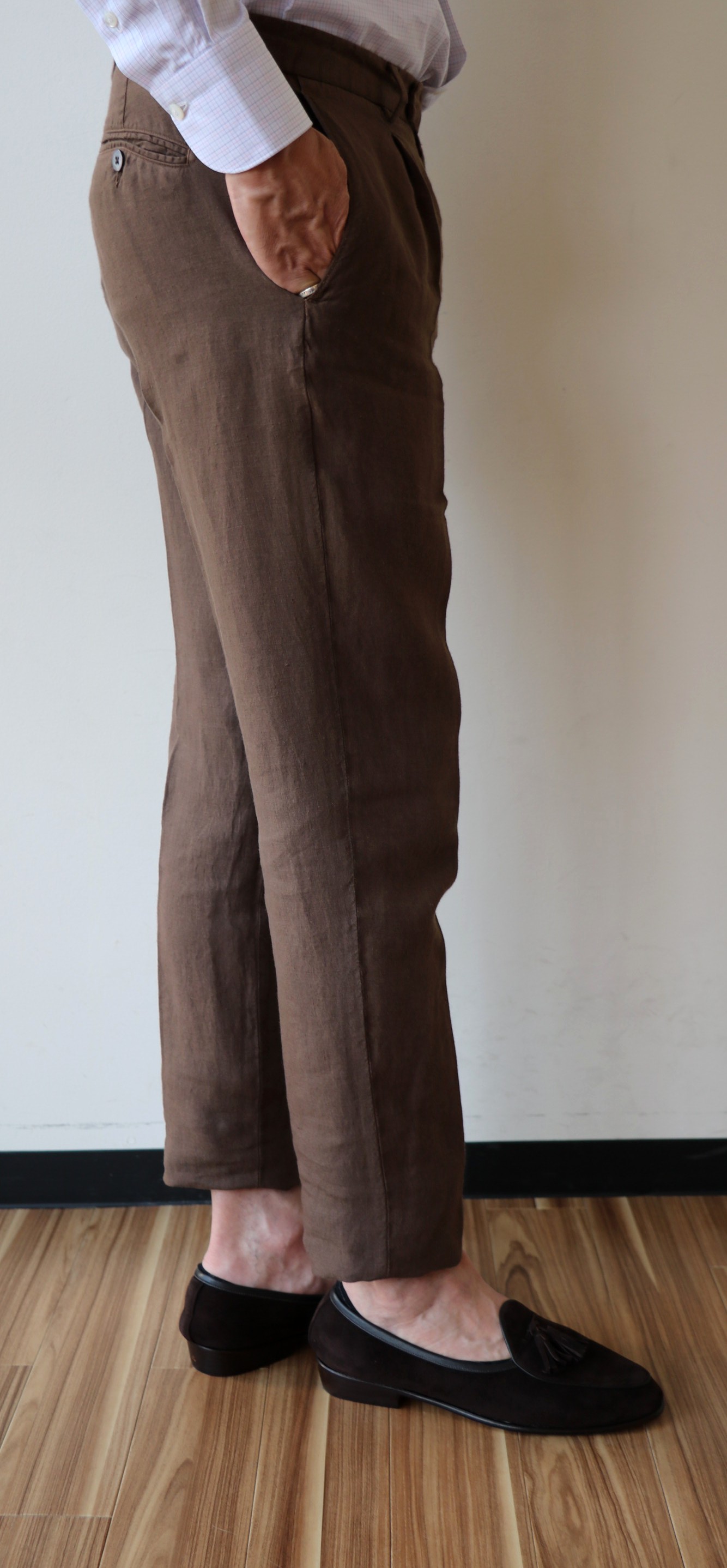 大好物のブラウン系のスーツです。今回、リネン100%でセレクトしましたが、残念ながら入荷したのは、サイズ46のみ。おかげで着用には困りませんでしたが、他のサイズの方にはお詫びしなければなりません。