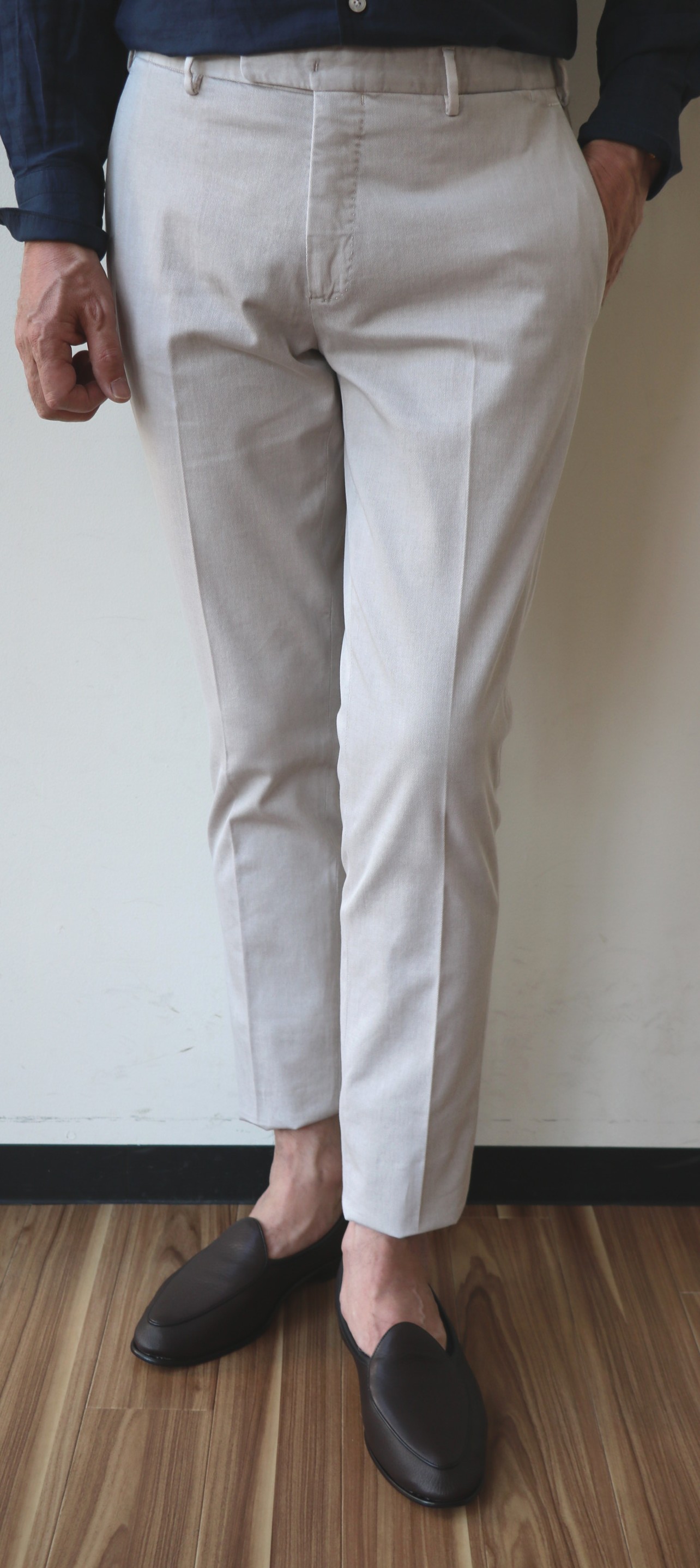 お見苦しい写真です。サイズ46がジャストのところ、成長したせいもあり、44を無理やり着ております。オーダーは44から50まで。入荷したのは、44と50の2サイズのみでした。あわせたシャツは、大人気のFinamore(フィナモレ)の「USTICA」。手に持ったバッグはTIBERIO FERRETTI(ティベリオフェレッティ)、靴は私物のBAUDOIN&LANGE(ボードインアンドランジ)です。