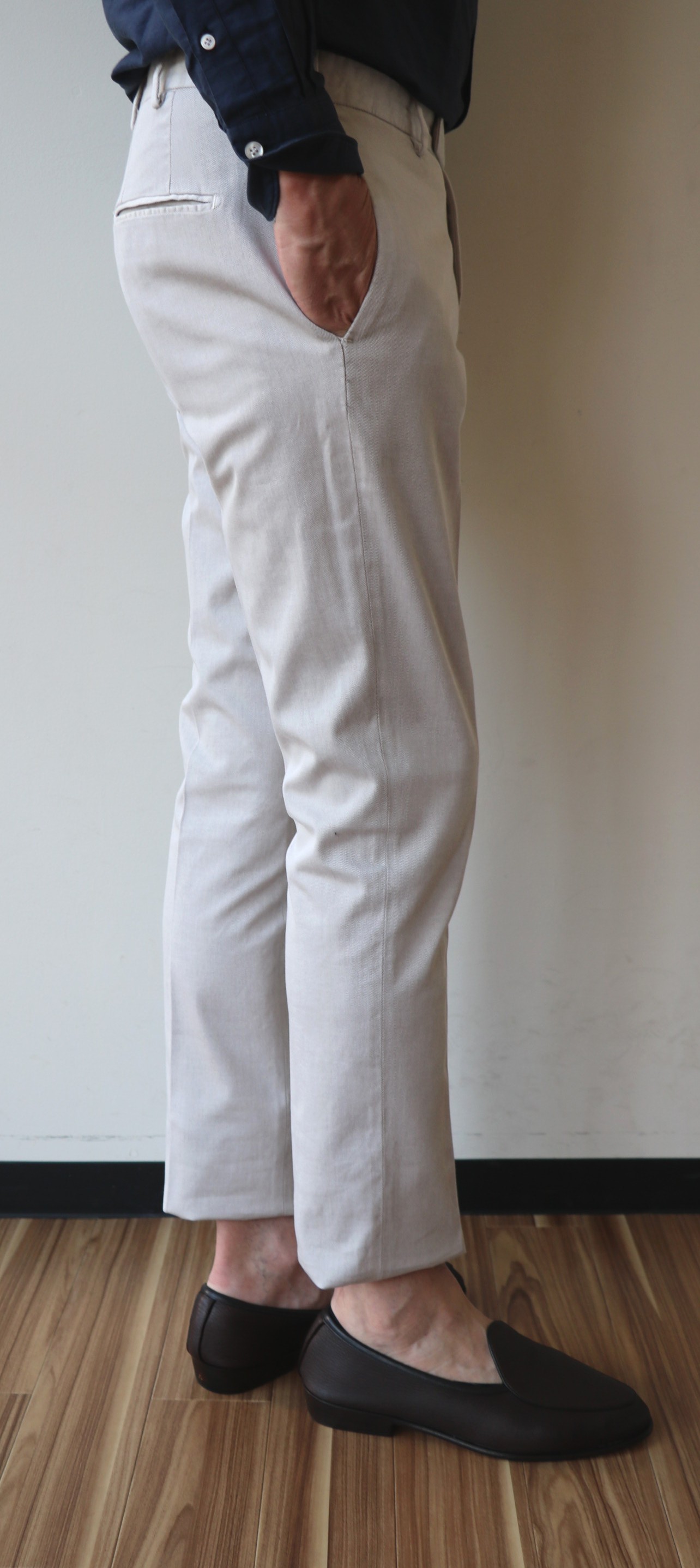 肩の芯地を薄く軽い仕立てに仕上げた「NAPOLI」の8ドロップ。ワンプリーツのやや膨らんだ腰周りから、裾にかけて流れるようなテーパードパンツが、大人の余裕とエレガンスを感じさせます...と、過去の説明文を引用しながら、考え中です。
