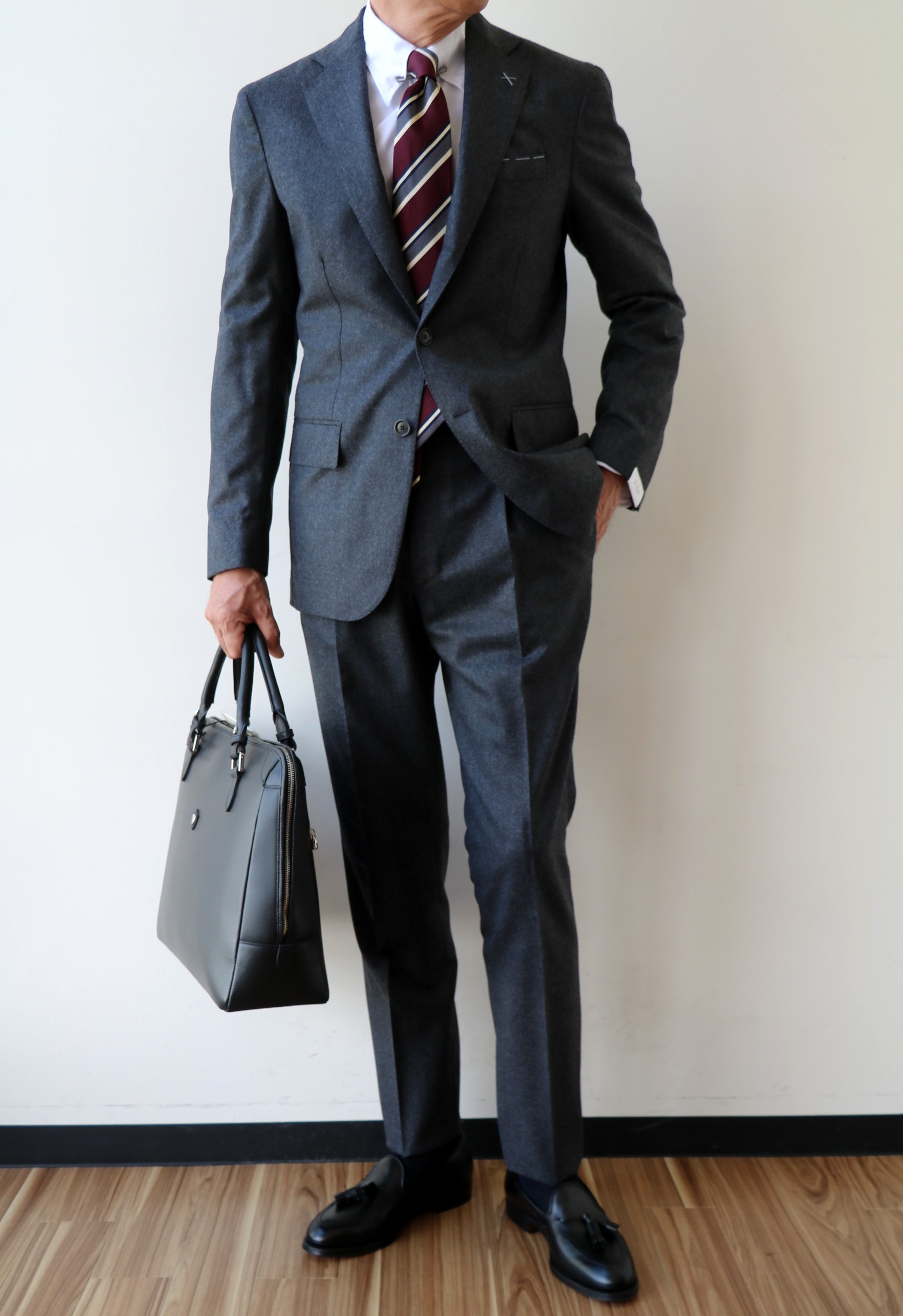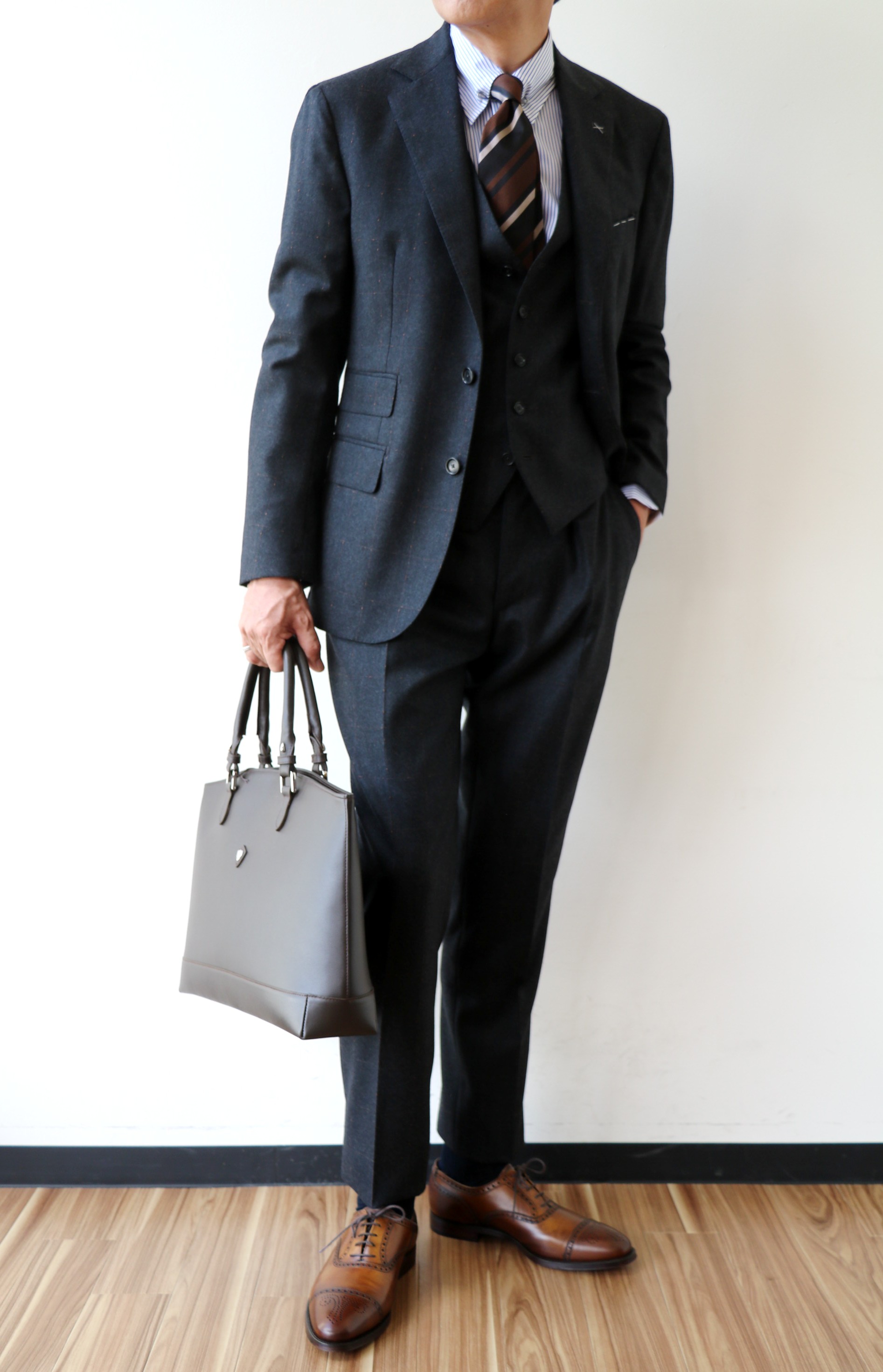 合わせたシャツは私物のBAGUTTA(バグッタ)、ネクタイはFRANCO BASSI(フランコ バッシ)とHolliday&Brown(ホリディアンドブラウン)、靴はCROCKETT&JONES、バッグはCHAMBORD SELLIER(シャンボール セリエ)です。