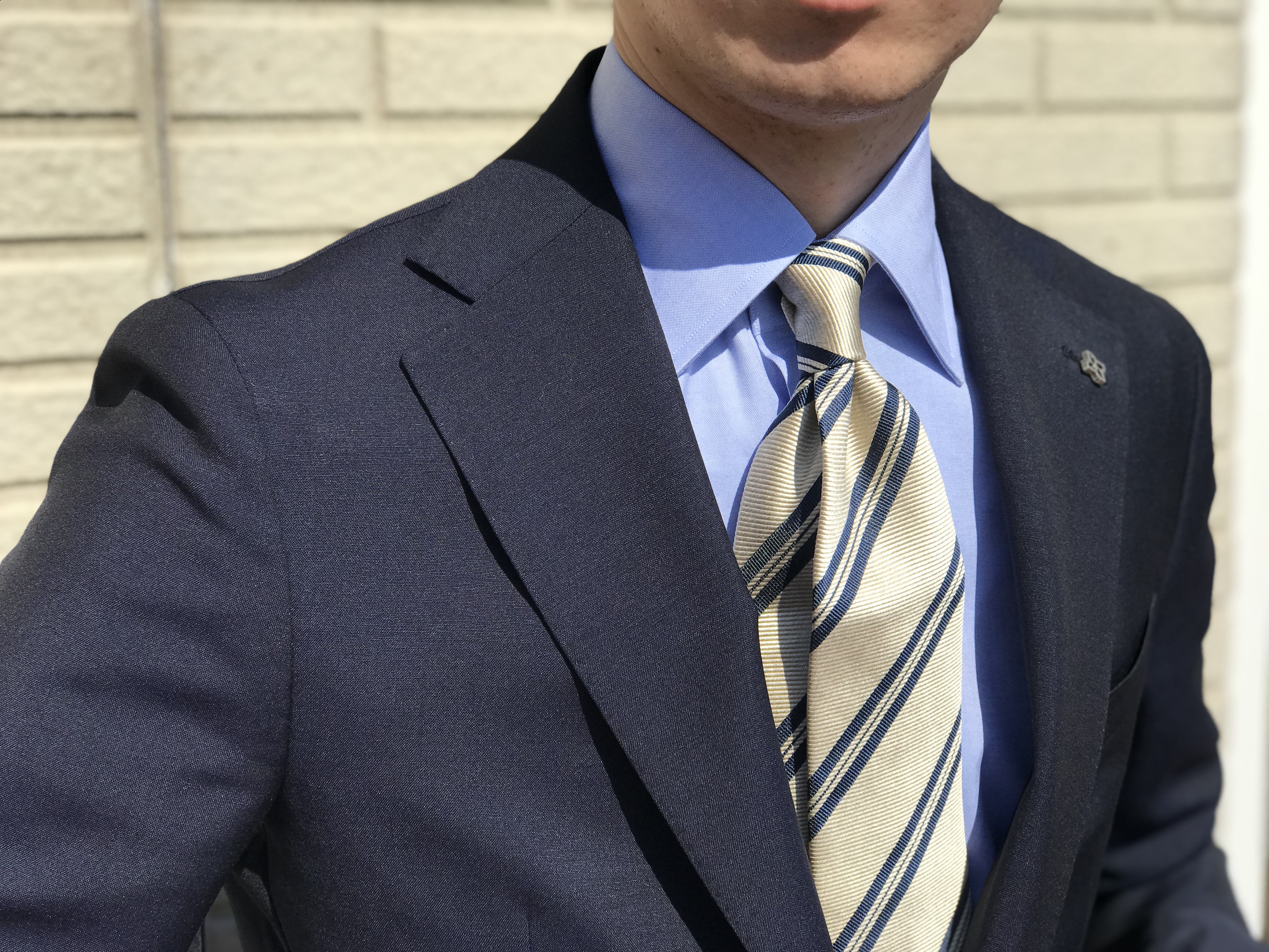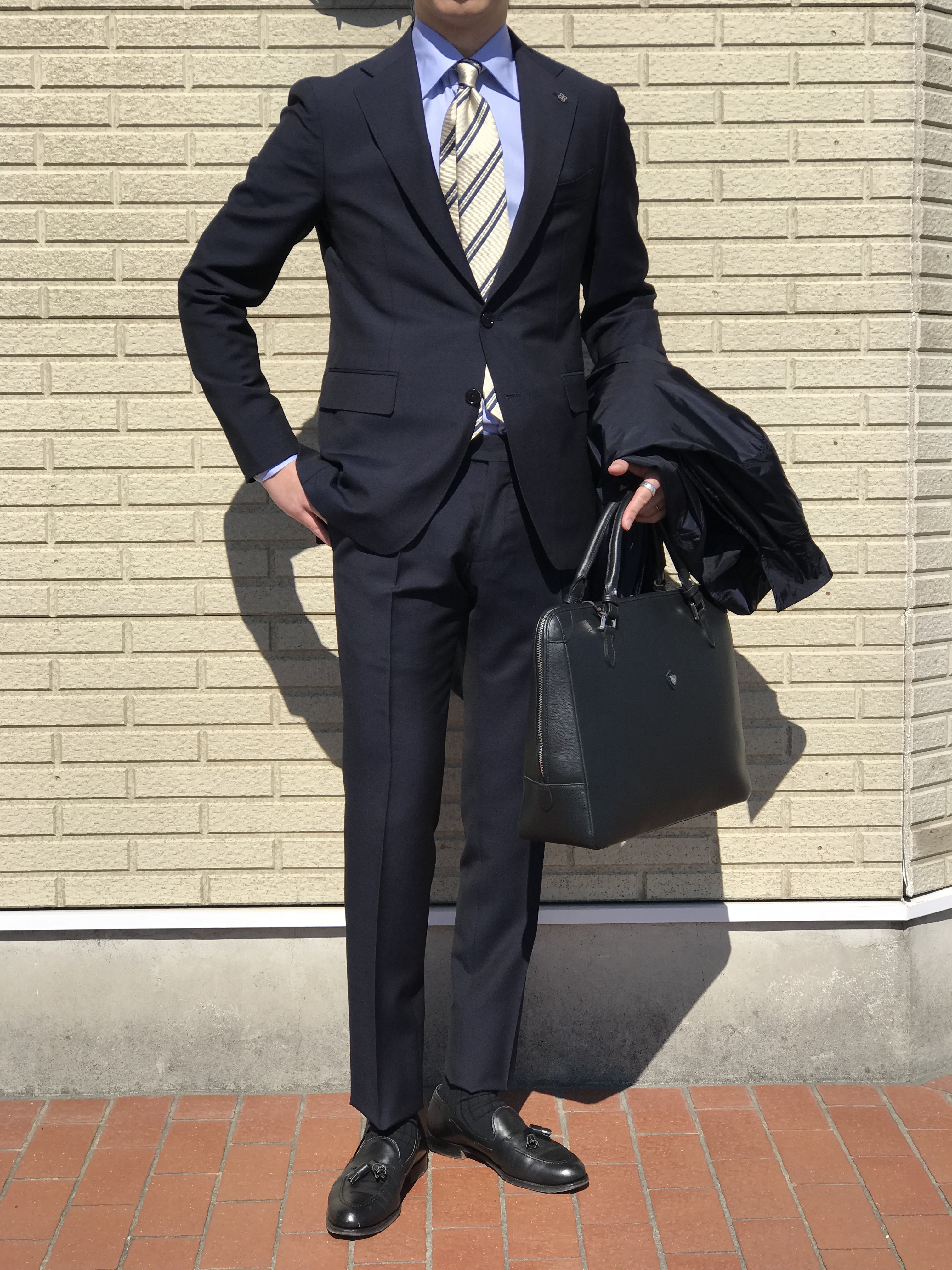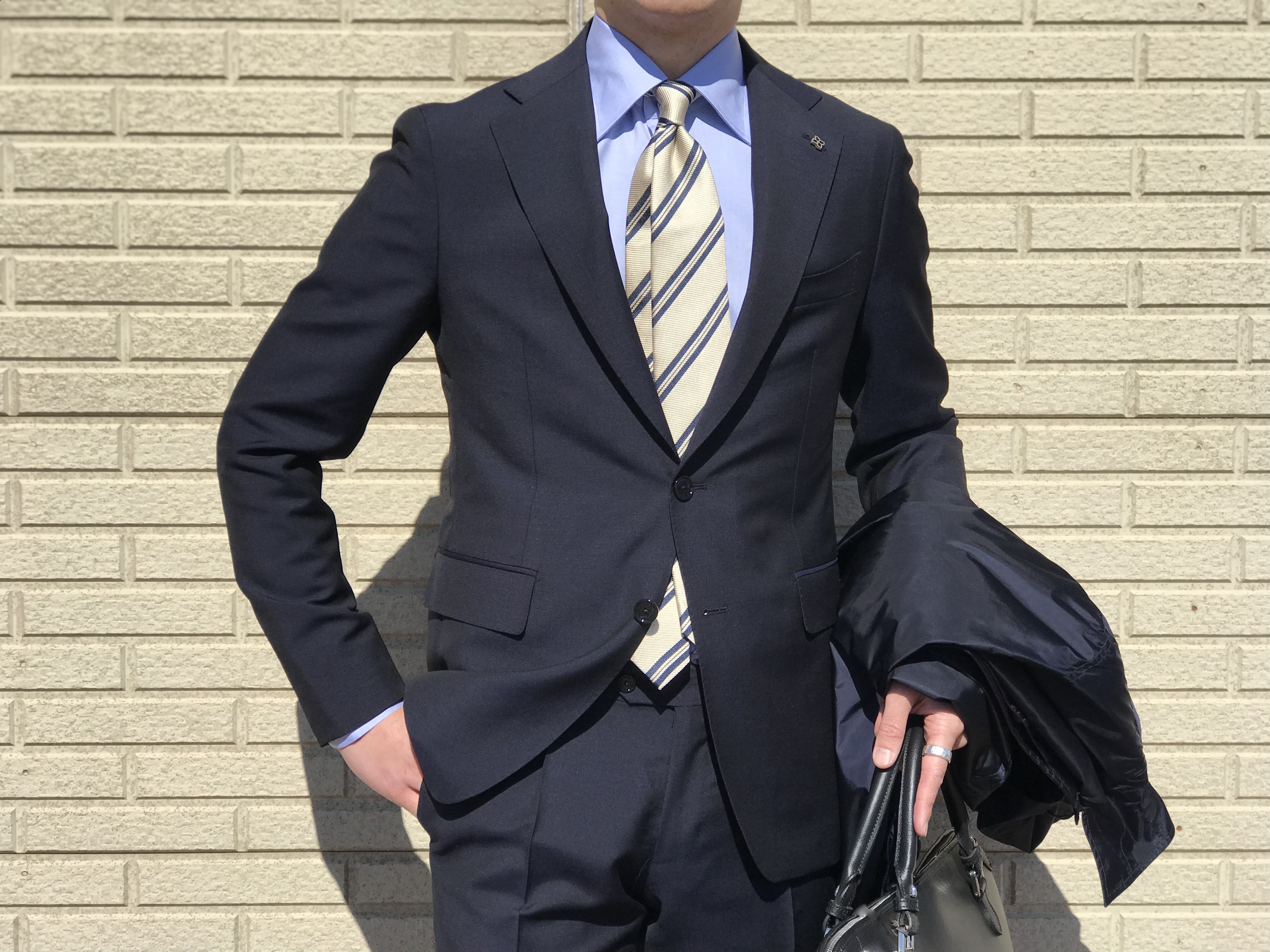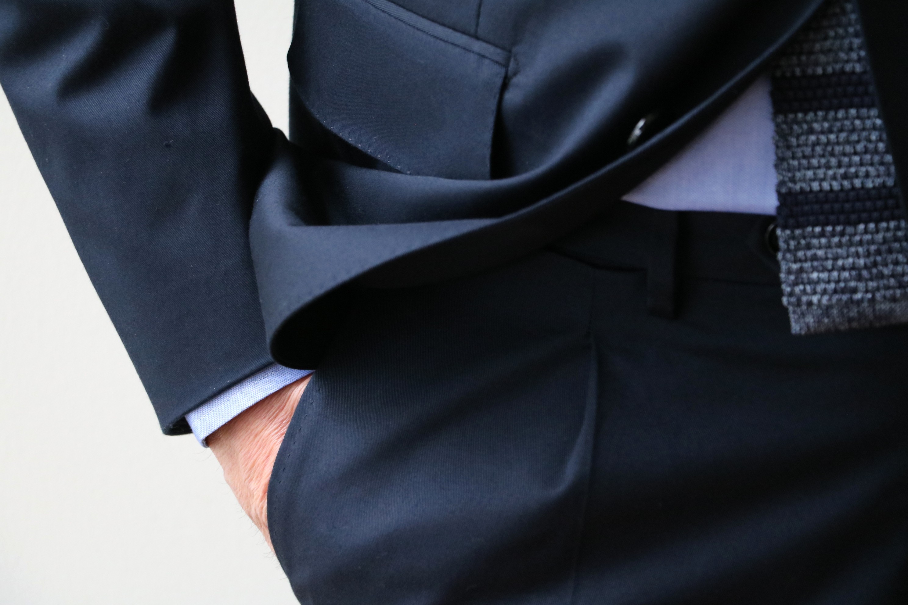 厚すぎず薄すぎずの良い塩梅の生地感です。綾の織地も目立たず、夏を通して秋口までは着用できます。やや濃い目のサックスブルーに同系色のニットタイを合わせ、全体をシックでありながらスポーティーにまとめてみました。