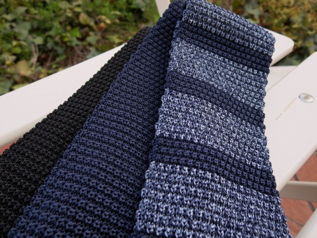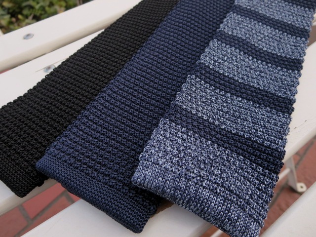 本日ご案内させていただく【FRANCO BASSI/フランコバッシ】は、この3本のニットタイ。インディゴブルーにネイビーのホリゾン柄とネイビーとブラックの無地です。