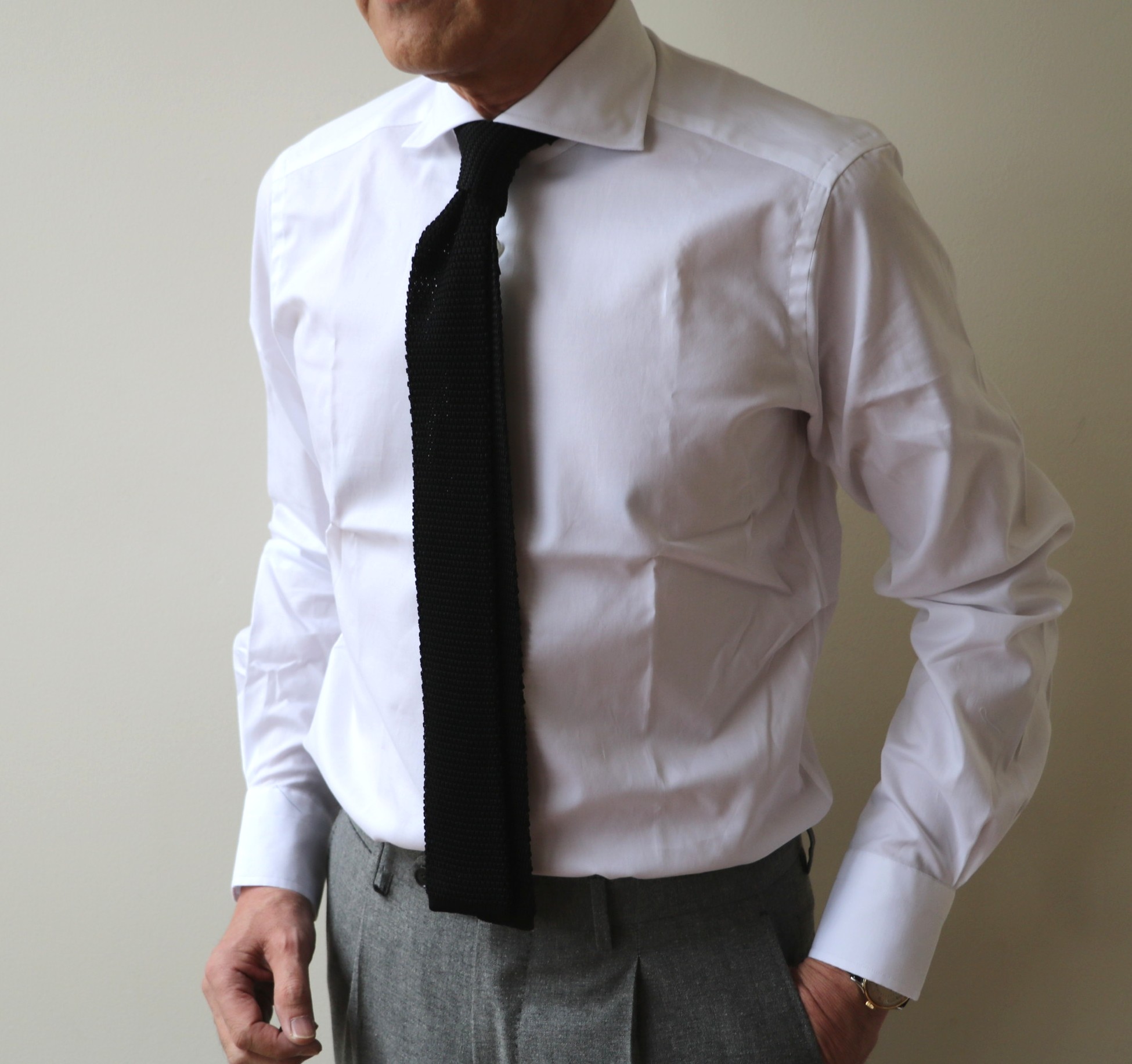 ここではブラックのニットタイを締め、仕事の顔を、いや夜遊びでも十分に使えるコーディネートです。ニットタイのもつ気楽さがそう見せるのでしょう。