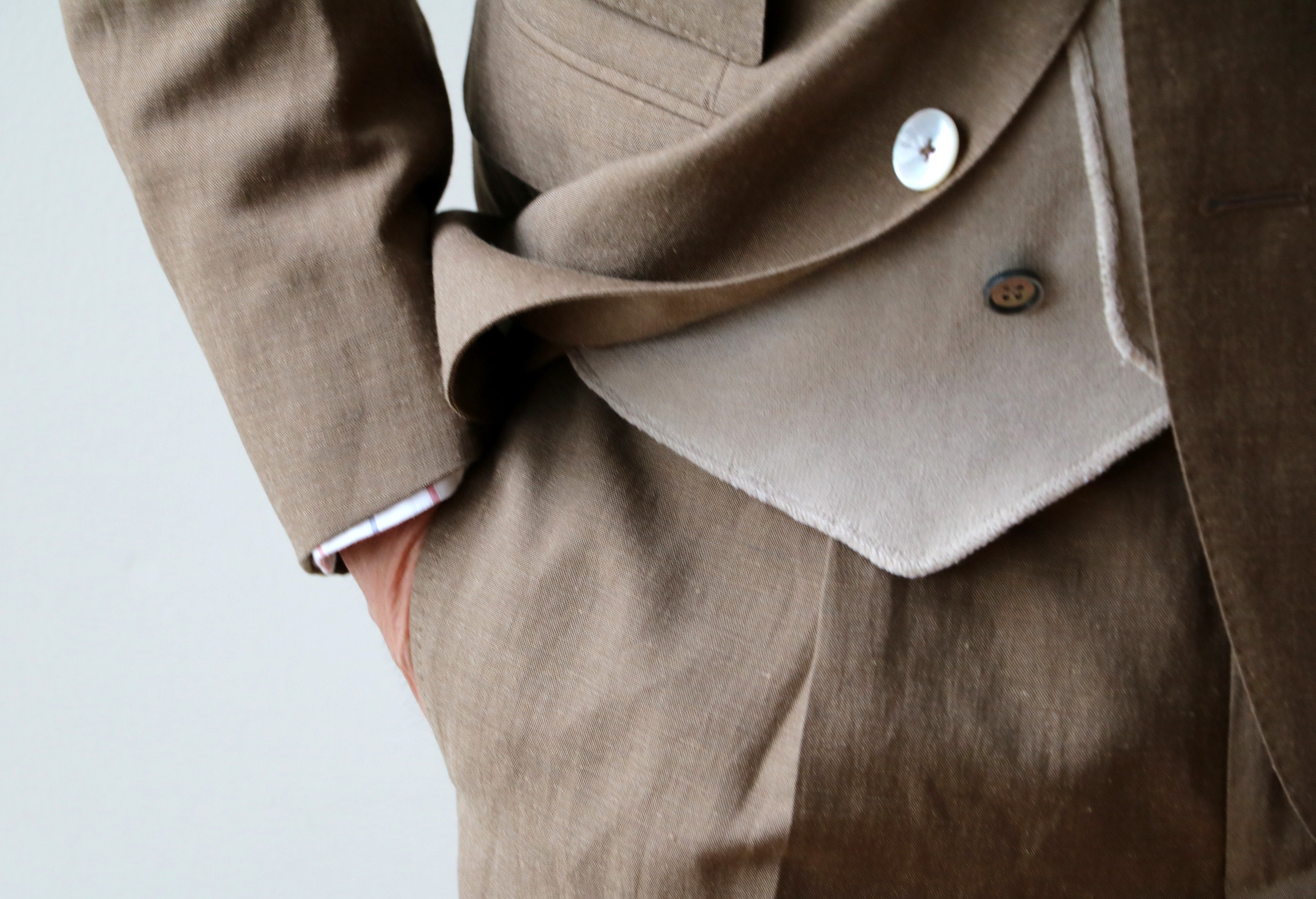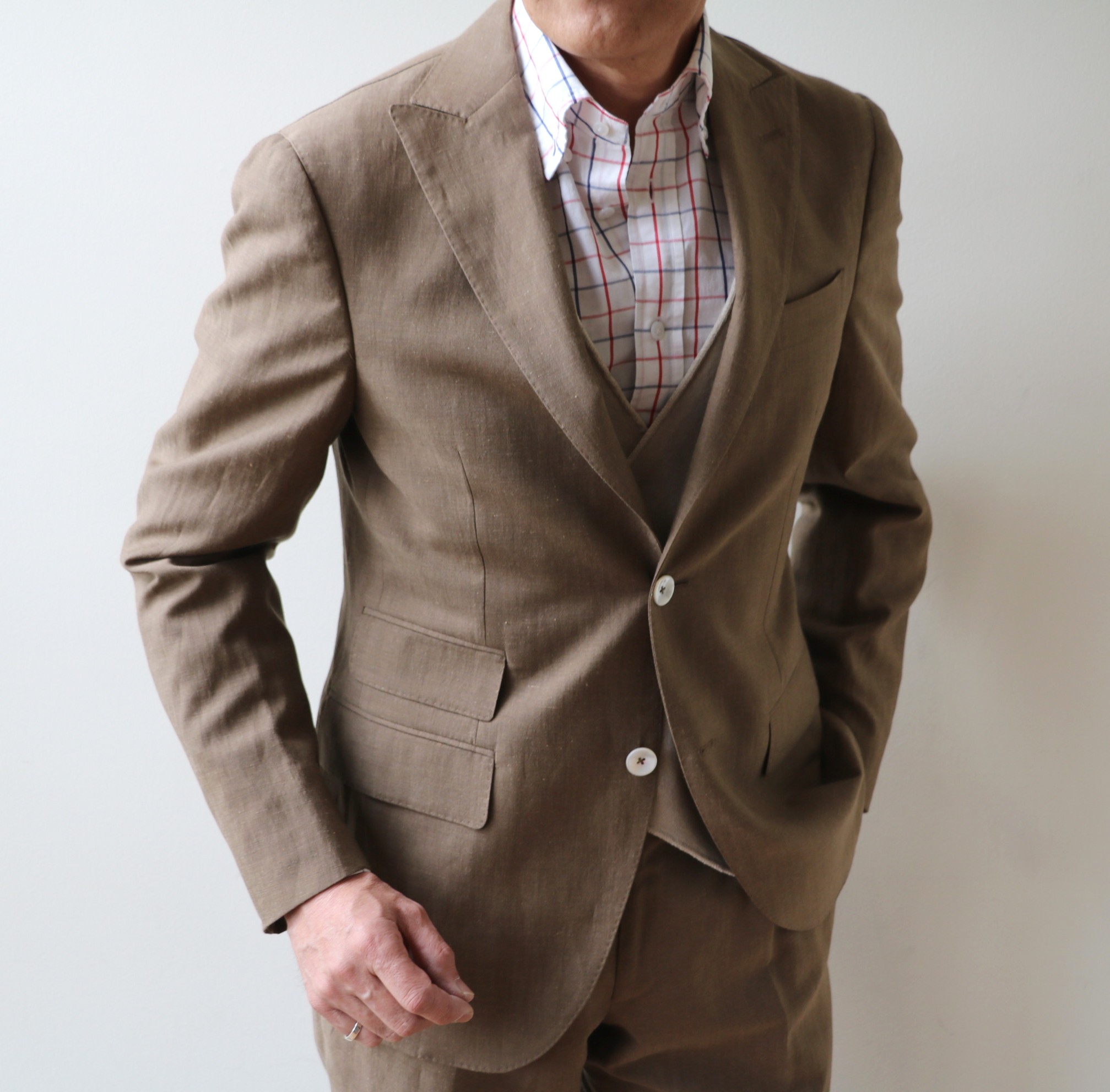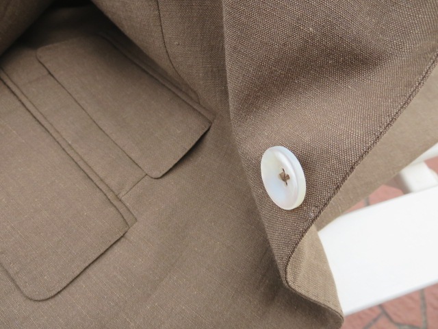 素材は、ウール・リネン。コットン・リネンよりウールを使うことで、しなやかな肌触りとエレガントな表情を作り出します。よく「シワになりますか?」とお問合せがありますが、「なります。ただ、シワは優雅な柄です」とお答えしております。他にも、このスーツの魅力としてお伝えしたいのは、色。日本の伝統色に"枇杷茶"という色があります。熟した枇杷の実が茶色がかったような黄褐色のことです。写真で見るより、やや黄色味があると思ってください。セクシーな色です。