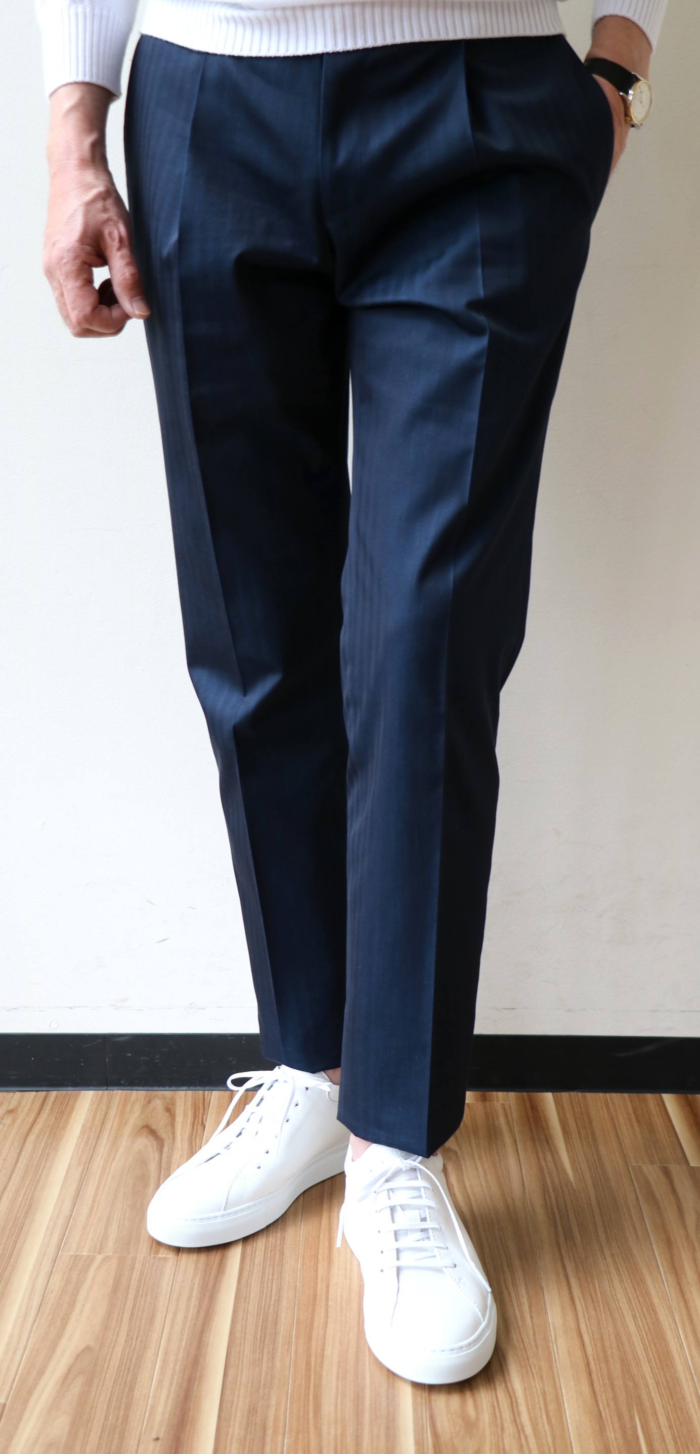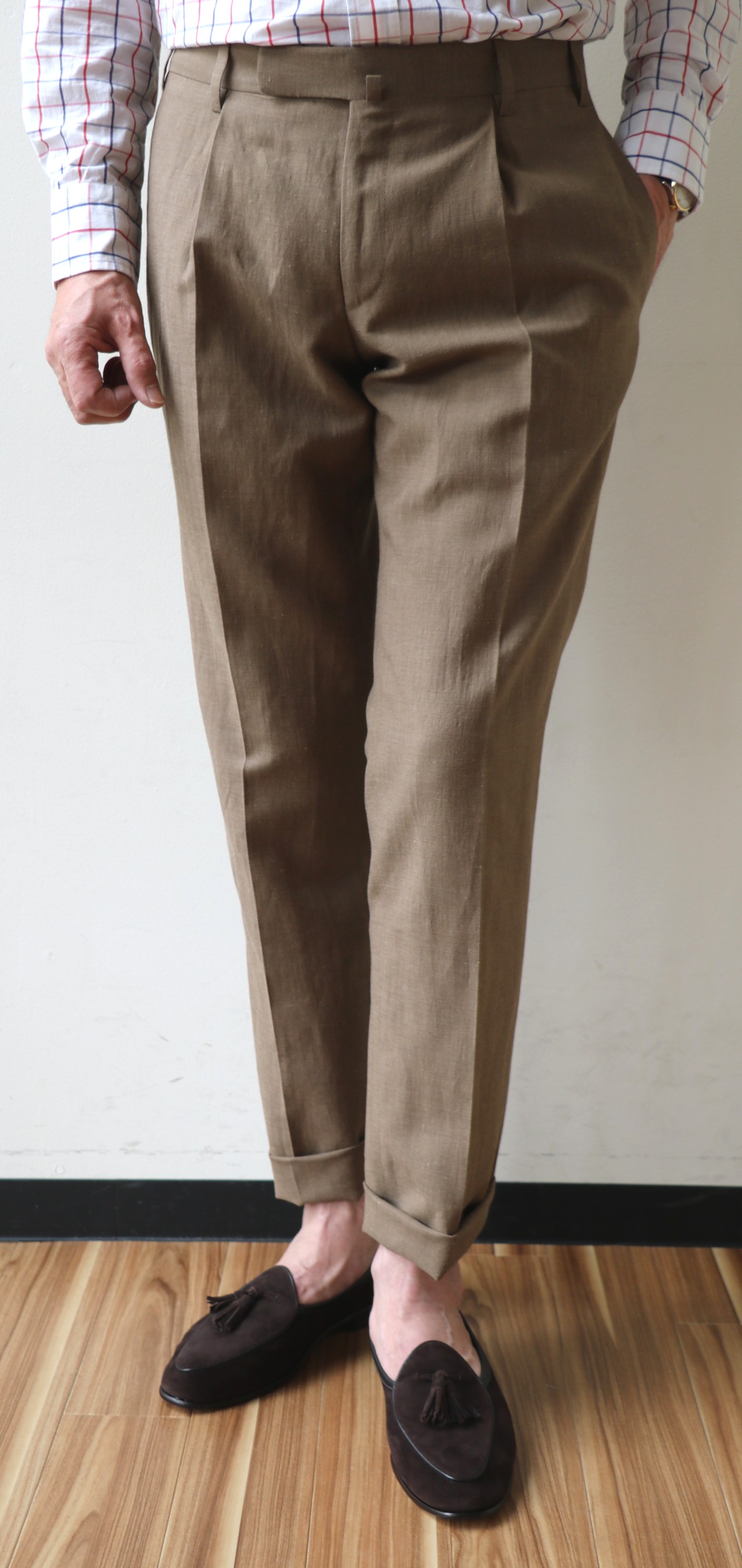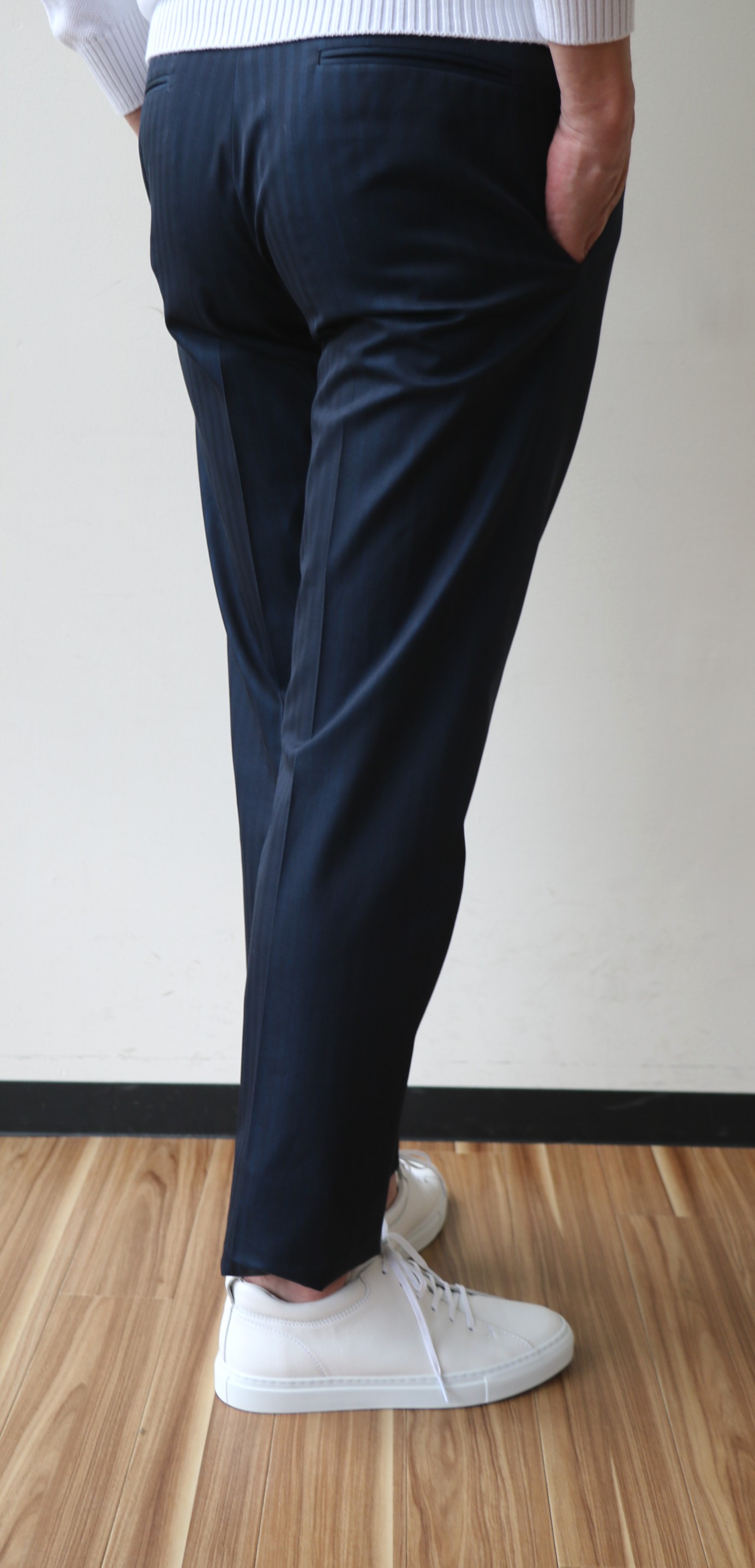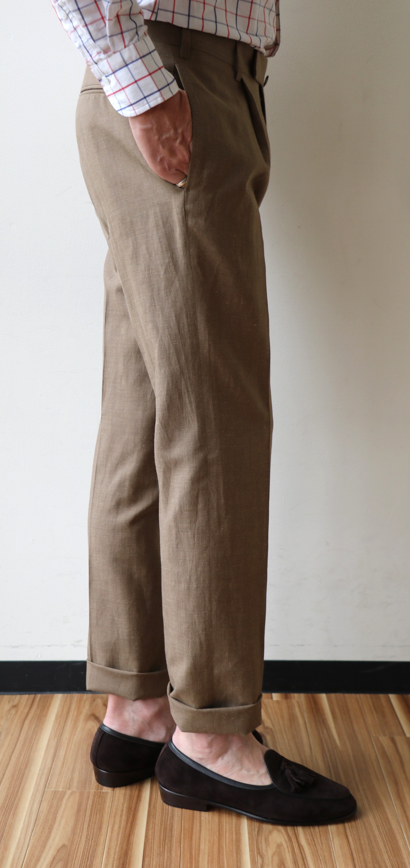パンツは、上着とのバランスで自ずからラインが決まってきます。フロントは、アウトのワンプリーツ。程よいゆとりのあるテーパードフォルムです。