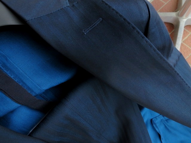色々な角度で、写真を撮りましたが、上の色合いが最も近いでしょうか。ソラーロのコットン生地です。それもアズーロ(青)。イタリア語で太陽を意味するソラーロ。本来は経糸がややグリーンがかったベージュ、緯糸が赤の綾織りですが、現在は他の色も含めて、その名で呼んでいます。この生地の場合、経糸がネイビー、緯糸がブルーで織られた、シャドーのストライプ柄になっています。つい脱ぎたくなってしまうスーツです。