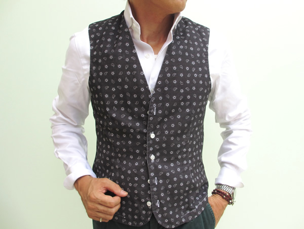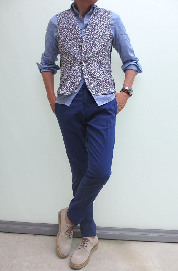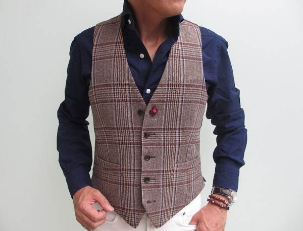 まだ未公開のJ.W.BRINE/ジェイダブリューブラインのパンツとAVIO/アヴィオのシャツに合わせたジレ。5月12日のNEWSで”マリオ・ムスカリエッロ=グローリーガイとなれるように”と宣言したとおり、今季も力を入れている【Mario Muscariello/マリオ・ムスカリエッロ】でございます。
