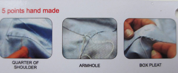 ショルダー、アームホール、前立て、ボタン留め、剣ボロのステッチと5工程がハンドで行われます。
