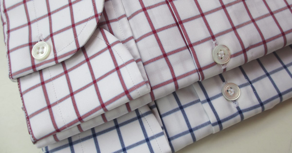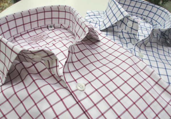 同じく「DUCA」シリーズから、レッドとネイビーのウインドウペンをセレクト。よく見ると、どちらの色にもサックスブルーのラインが寄り添っており、全体を和らげています。ネクタイは無地か大柄に限られますが、ニットの下に合わせると綺麗です。特にハイゲージのニットには使いやすいシャツになりそうです。