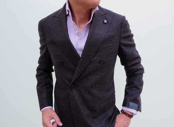 モデルは身長175㎝、体重63㎏、胸囲91㎝でサイズ38を着用しております。羽織ったジャケットは、LARDINI/ラルディーニ(未公開)です。