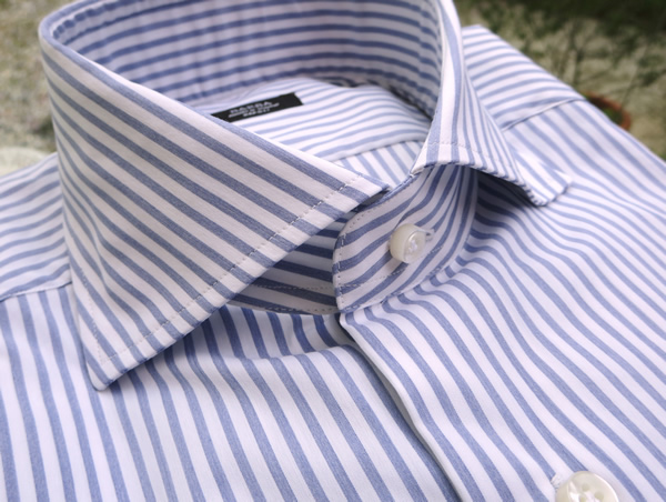 モデルは身長175cm、体重63K、胸囲91㎝で、サイズ38を着用しております。衿型は、BARBA/バルバの「BRUNO」が採用しているホリゾンタルカラーより衿羽の開きが狭いワイドスプレッドカラー。この衿を、英国のウィンザー公が着用していたことから、ウインザーカラーとも呼びます。ネクタイの収まりが良く、ノータイで着た際も美しいロールを見せてくれます。ナポリのシャツらしく背にダーツはありませんが、脇からウエストにかけてタイト過ぎない自然な絞込みが特徴です。