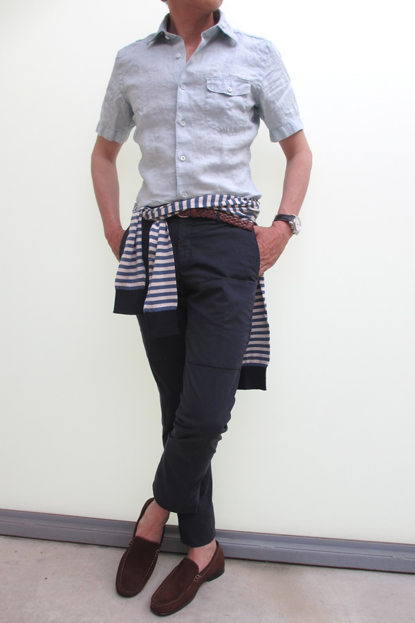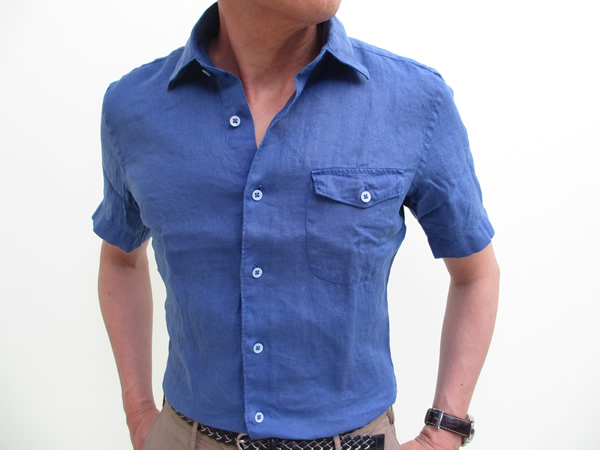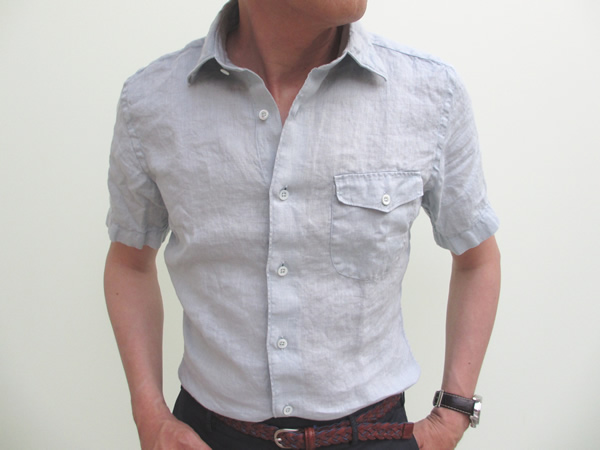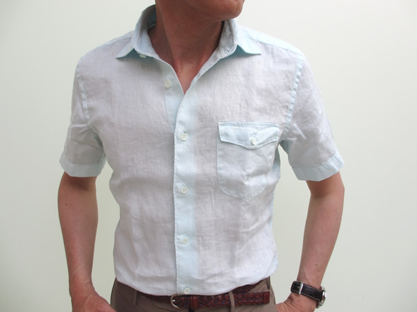 イタリア人は夏でも長袖のシャツを着ます。袖をたくし上げて着るのが、カッコイイのです。個人的にも半袖のシャツは着ませんが、あるファッション誌に半袖シャツの袖をまくって着ている姿が妙に新鮮で素敵に見えたのです。裾幅の狭いパンツをロールアップした際の新鮮さと同じですね。