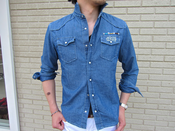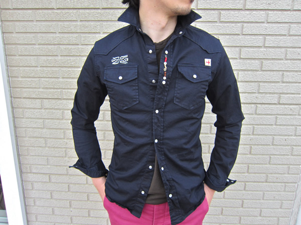 こちらは中央にカラフルなビーズがあしらわれ、何を意味しているか解りませんが、右胸に絵文字です。デニム生地とは違って、シャープなラインで男前な感じがします。