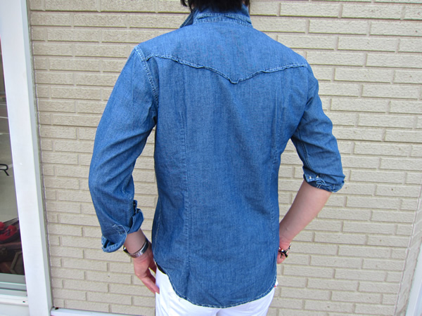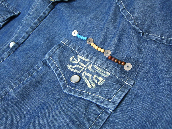 左胸にはウエスタンシャツらしくビーズがあしらわれ、ナスカの地上絵のような、または古代文字のようなものが描かれていています。ネイティブな感じを上手く作り出していますね。