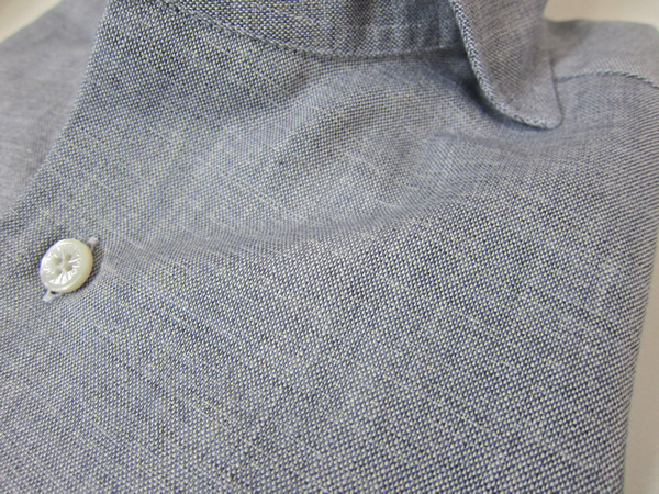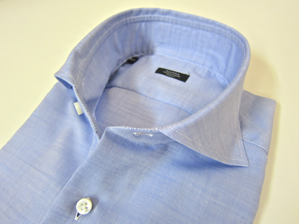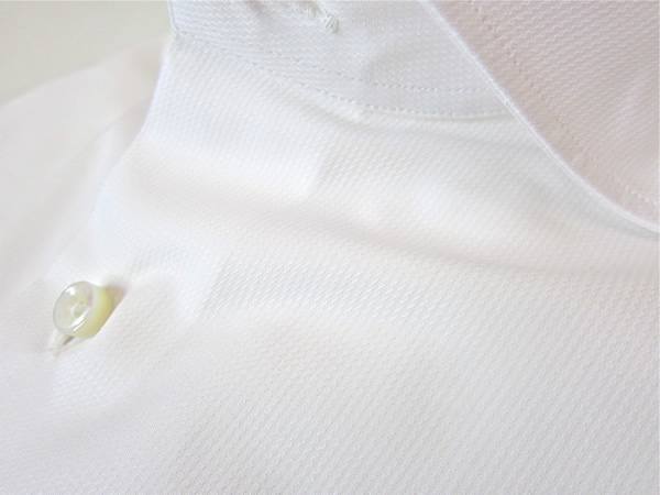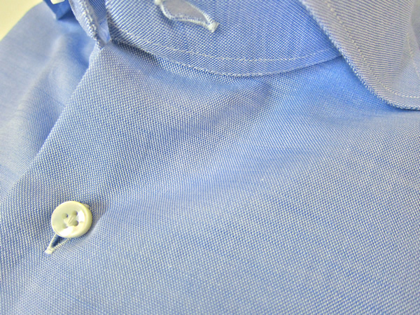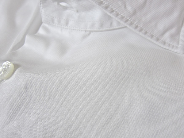 オックスフォード生地と織り組織は一緒ですが、細い糸を使用しているため、より艶やかで光沢のある生地に仕上がっています。このシャツは、一年を通して活躍する定番生地としても人気です。