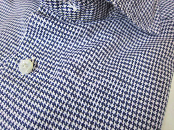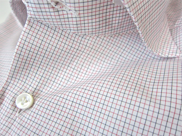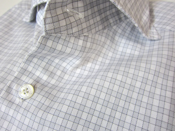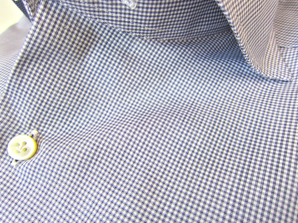 遠目からは、細かなギンガムチェックにも見えますが、よーく目を凝らしてみると、ネイビーの変則的なチェック柄に対し、さらにシルバーグレーのボーダーラインを引いた変わり種。