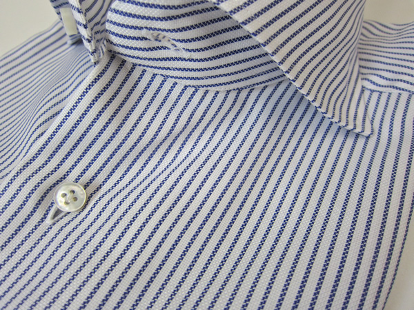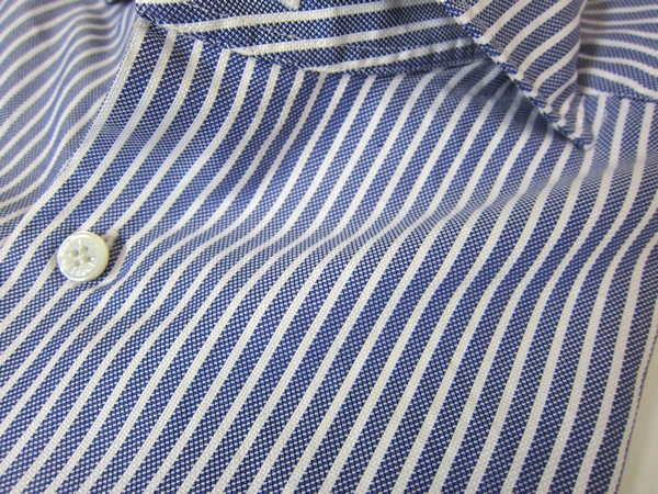 ザックリとしたオックスフォード地に、ブルーのトラックストライプを入れたもの。肉厚の生地に、ハリコシのある質感が、ツイードジャケットやウールタイに好相性です。