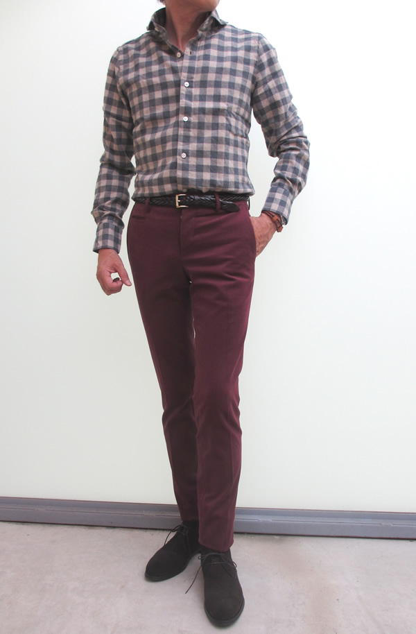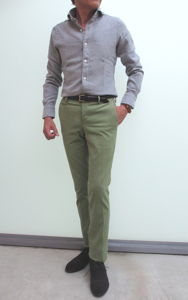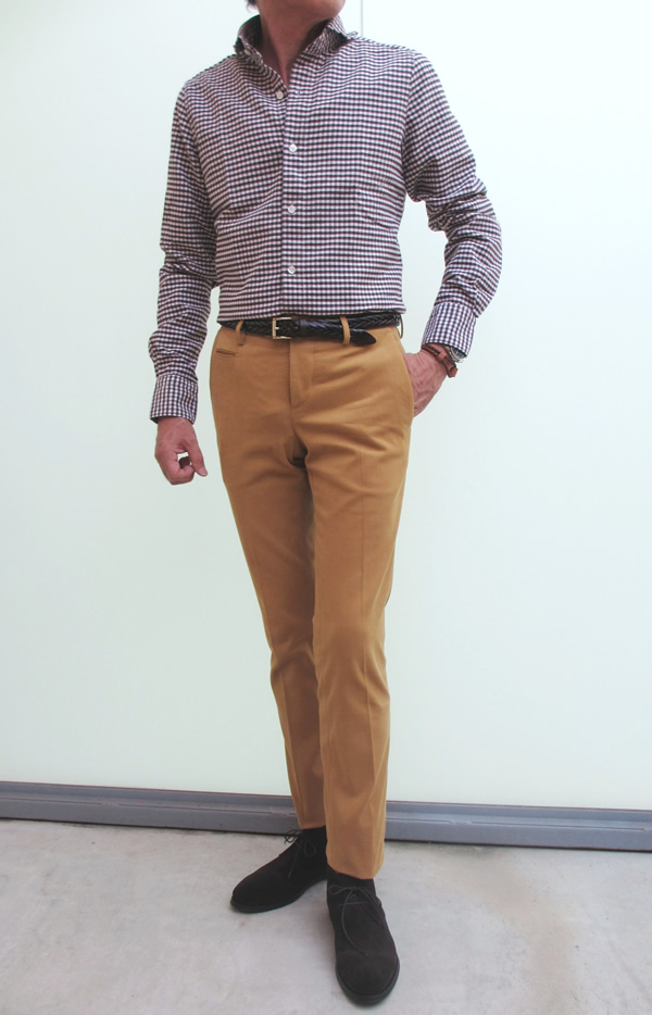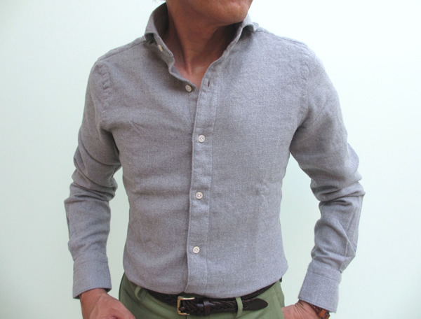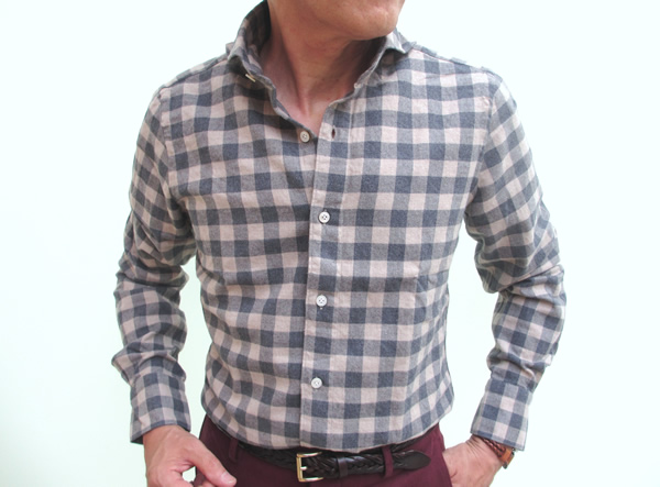 カシミア入り?と思わせるほど、柔らかなコットン100%のネル地です。ライトグレー、エクリュ、グリーンの3色をセレクト。今季、チェック柄のパンツが大流行!? するはずです。ジャケットやニットの柄物に無地は効果的。今季お勧めのシャツです。