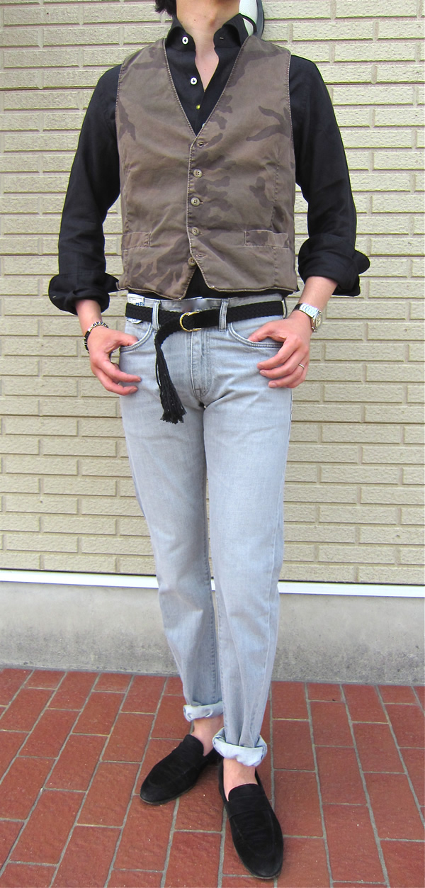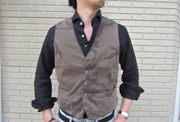 最後に、全てのジレは背が切り替えになっています。カモフラージュ柄のみはグレーですが、他は全てブルーのシャンブレーです。両脇にはアジャスタ釦が付き、サイズ調整ができるのが嬉しいです。
