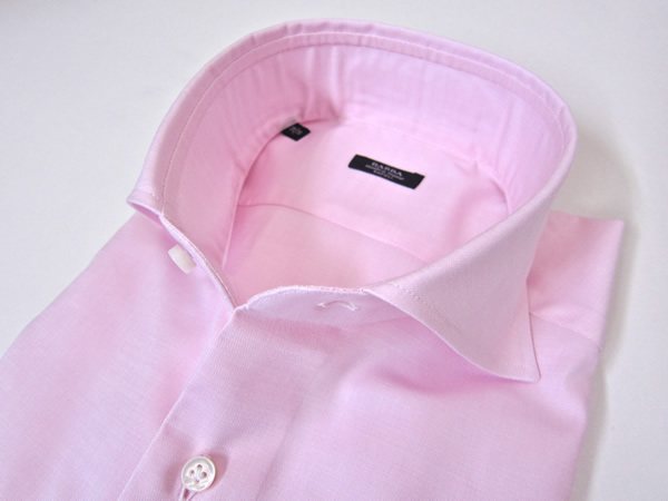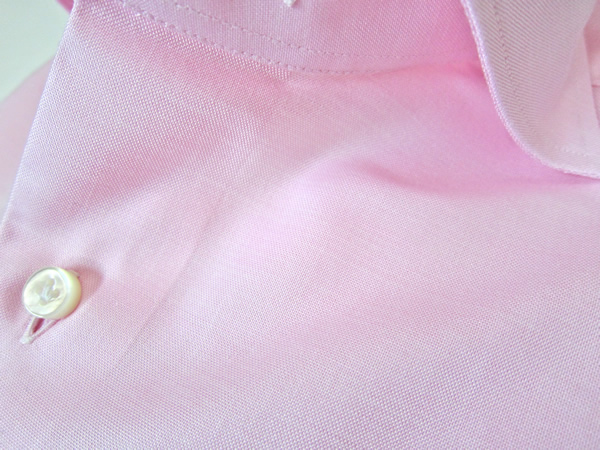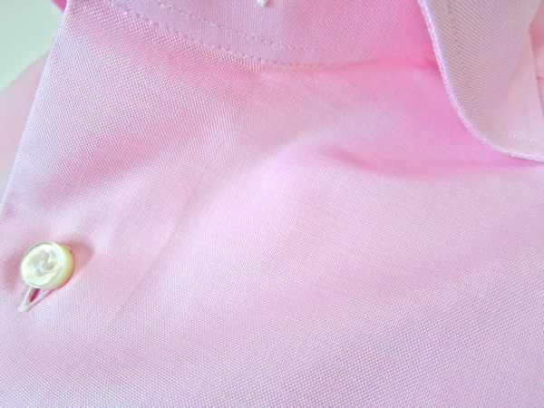 まずはピンク。ボーダー柄のように織られていますが、通常、縦線として使うシャツは良くありますが、それを敢えてボーダーとして使ったもの。
