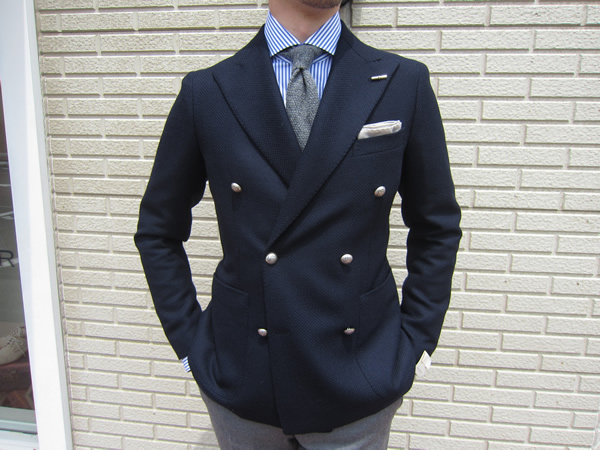 モデルは身長180㎝、体重65㎏、胸囲93㎝でサイズ38を着用しております。合わせたジャケットはTAGLIATOREのダブルブレスト、ネクタイはFRANCO BASSI、パンツはPT01です。