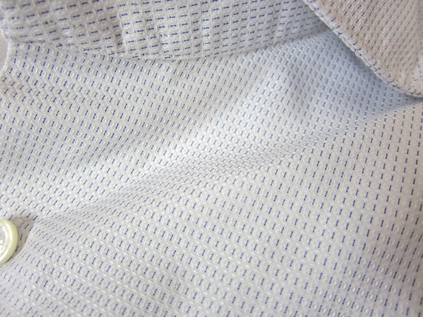 変則的なマイクロチェック柄。縦横にシルバーのラインが入り、その間には縦方向へブルーの糸を入れています。遠目には無地に見えますが、織りによって凹凸の表情と、光沢が出てくるのが特徴です。