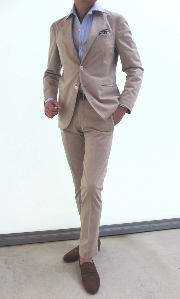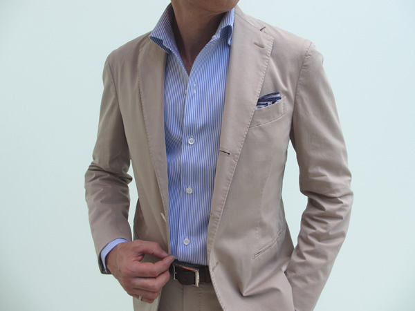 どうです? この涼しげな表情。ざっくりとしたガーメントダイ加工のホップサック地は、発汗性に優れたリネン混。夏の盛りにも涼しげな顔で佇んでいられるはずです。