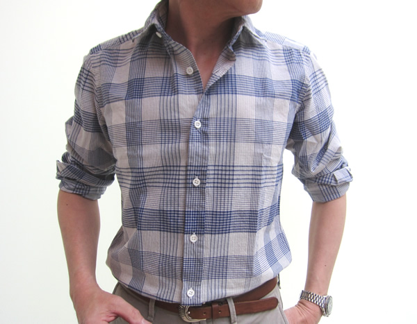 コツトン100%のブルーチェックは、小柄とブロックチェックでセレクトです。南に位置するナポリのシャツと比べると、生地のアレンジの仕方、色合いなど趣は異なります。シンプルでありながら、無個性ではなく、モダンでありながら、どこか懐かしい、着る人を知的に見せてしまうのも【Glanshirt/グランシャツ】の魅力と言えるかもしれません。