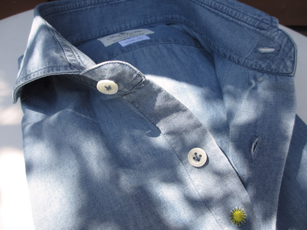 定番中のシャンブレーシャツは、旅でも必需品です。気軽に着れて、コーディネートを選ばない便利なシャツ。第2、第3釦の間にある太陽がアイコンです。