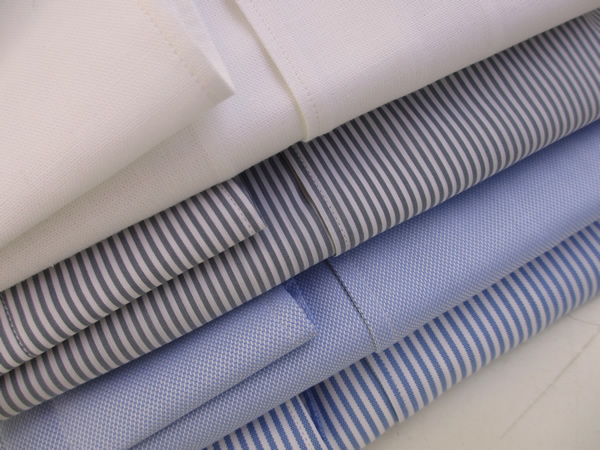 生地を上からご説明しましょう。白無地は、細い強撚糸(ボイル)を使用した平織り生地。薄手でシャリ感のある夏には最適な生地です。グレーのミニロンドンストライプは、表面になめらかな光沢があるブロード。コットンにポリエステル、ポリウレタンを入れることでシワになりにくく、ストレッチ性に富んだ生地です。ブルー無地は、ソフトで通気性のあるロイヤルオックスフォード。そして同じくロイヤルオックスフォードのロンドンストライプは、ブルーとホワイトのコントラストが涼しげです。