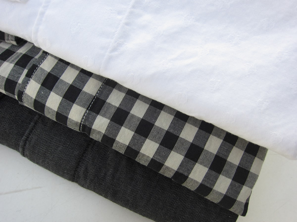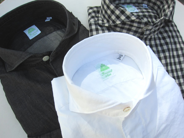 モダンなモノトーンシリーズは、花柄ドビーのホワイト(上)とギンガムチェック(中)、そしてストーンウォッシュのチャコール無地(下)のセレクトです。ナポリのカミチェリアが作るモノトーンは、モードになり過ぎないところが魅力です。夏のナイトシーンで着ている自分の姿が浮かんできました。その横には素敵な・・・。妄想でした。