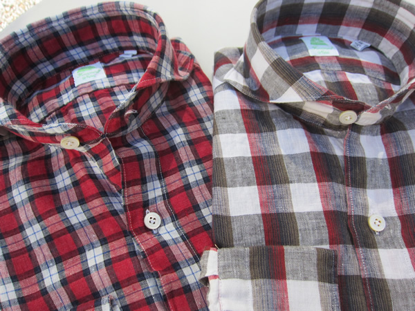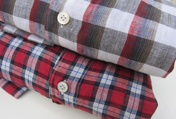 リネン100%のチェックは、赤を使った2柄。チェック柄は全く異なるのですが、品番は同じなんです。夏の太陽に対抗するには、やはり元気な赤。レッド×ネイビー×ホワイトのタータンチェックと縦に赤×ネイビー×オリーブを配した変形チェックです。
