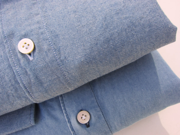 ブリーチ加工のシャンブレー(上)とコーマデニム(下)も入荷しております。濃いインディゴブルーと併せて持っていると、とても便利。チノパンツとの相性も抜群ですね。カジュアルシーンで年間使えるシャツとして、必ず手に入れておきたいシャツです。