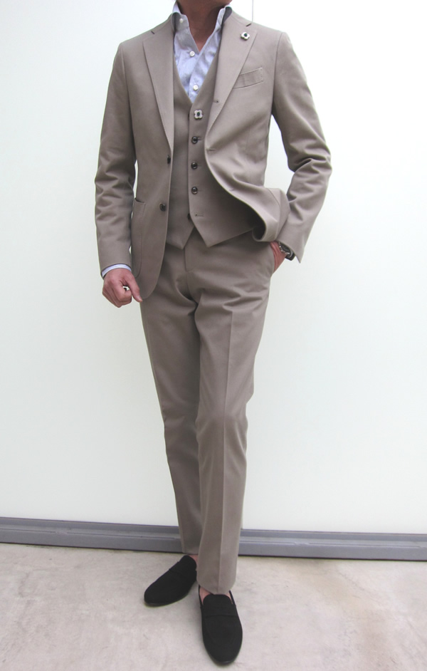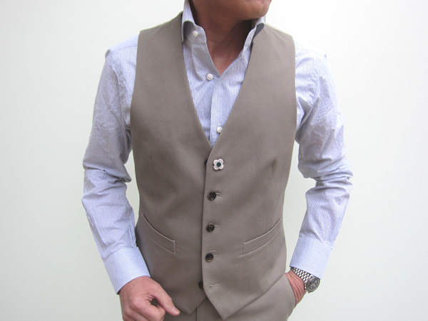 この【LARDINI(ラルディーニ)】のジレ。実は1月12日にご紹介させていただいたコットンスーツと共地なんです。このジレを合わせていただくと、厳格な英国貴族がイタリアに滞在しているうちにラテン化してしまった・・・そんなスリーピースになります。