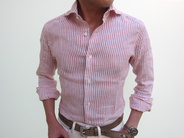 同じくリネンシリーズからカラーベースのストライプ。単調になりがちなコーディネートにアクセントとして使える便利なシャツです。チェックと違って砕けすぎず、かといって硬くならないのも魅力でしょうね。