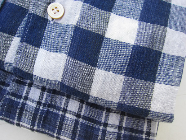 同じくリネン100%のネイビーチェック。ギンガムチェックに飽きた方には、ぜひお勧めのチェックです。この真冬の寒さの中でご紹介するのは、少々無理がありますが、、夏の海や湖でホワイトデニムやショーツを穿いている自分の姿を想像しながら、ご覧ください。それほどに清涼感のあるシャツです。