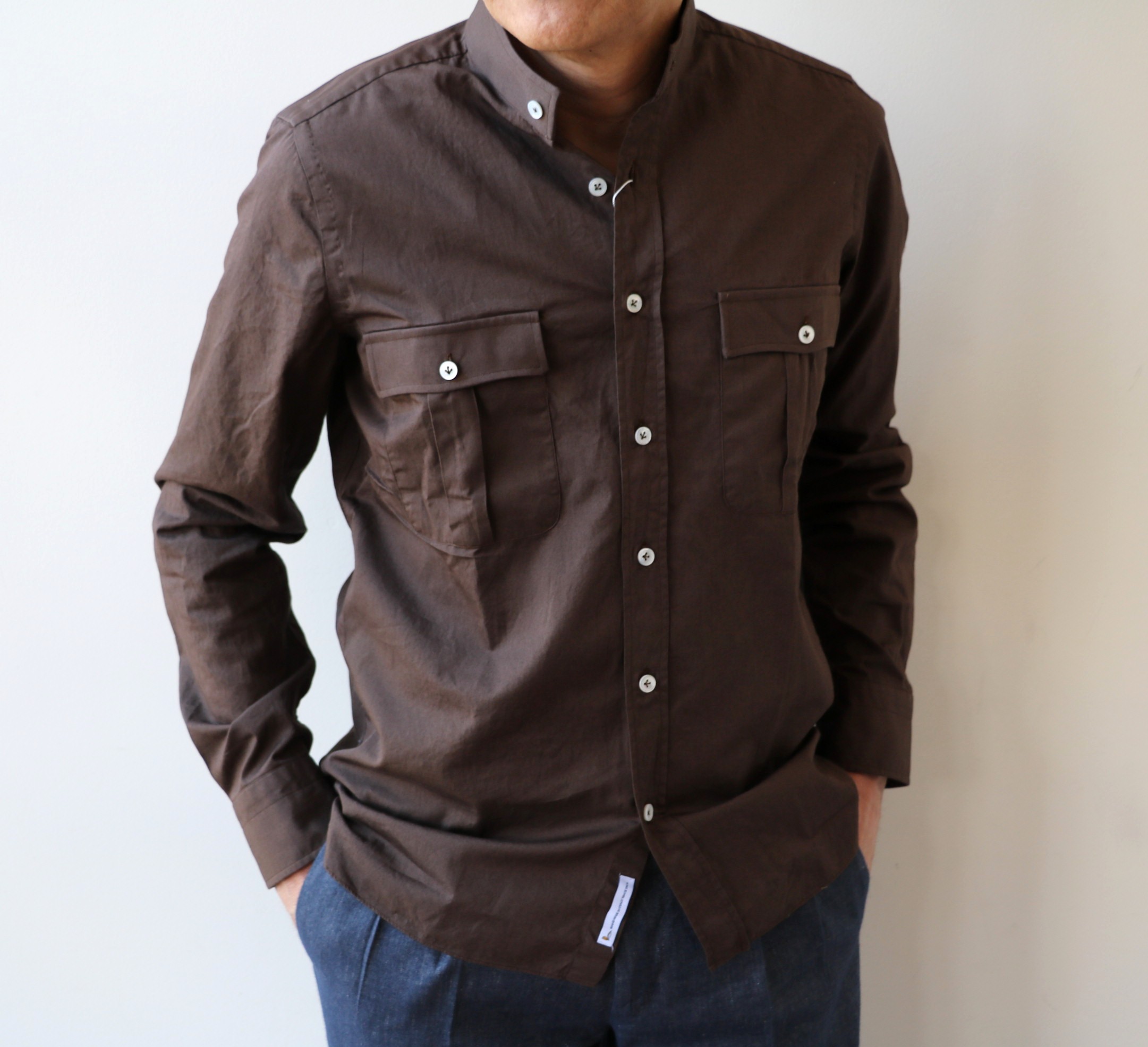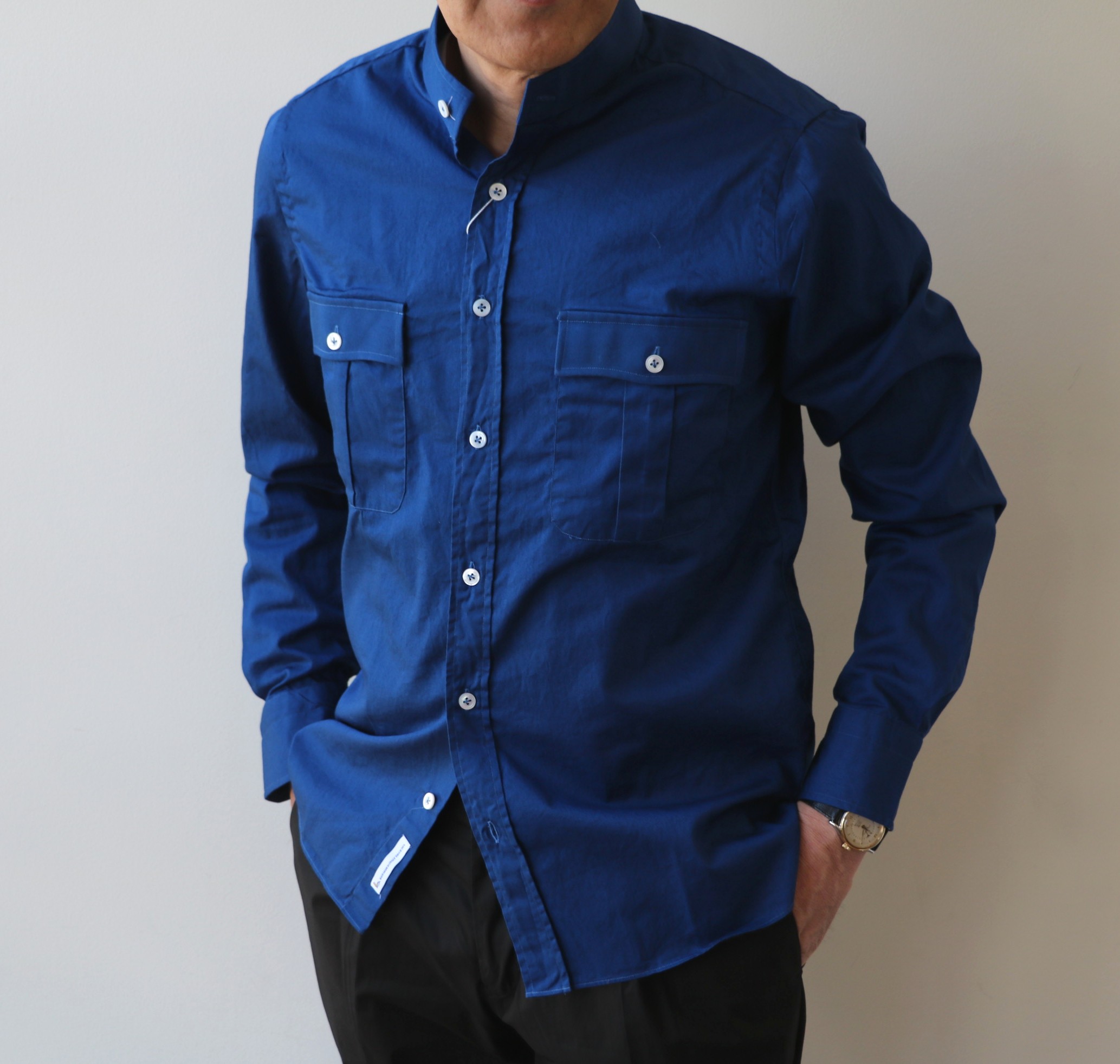 厚すぎず薄すぎずの適度のハリとコットン100%のナチュラルな伸縮性を持つツイル地。ワンウォッシュです。特徴は、両胸のフラップ付ポケットと4.0cmほどのスタンドカラー。ラギットな雰囲気とモダンな表情をもつ新しい感覚のシャツに仕上がっています。