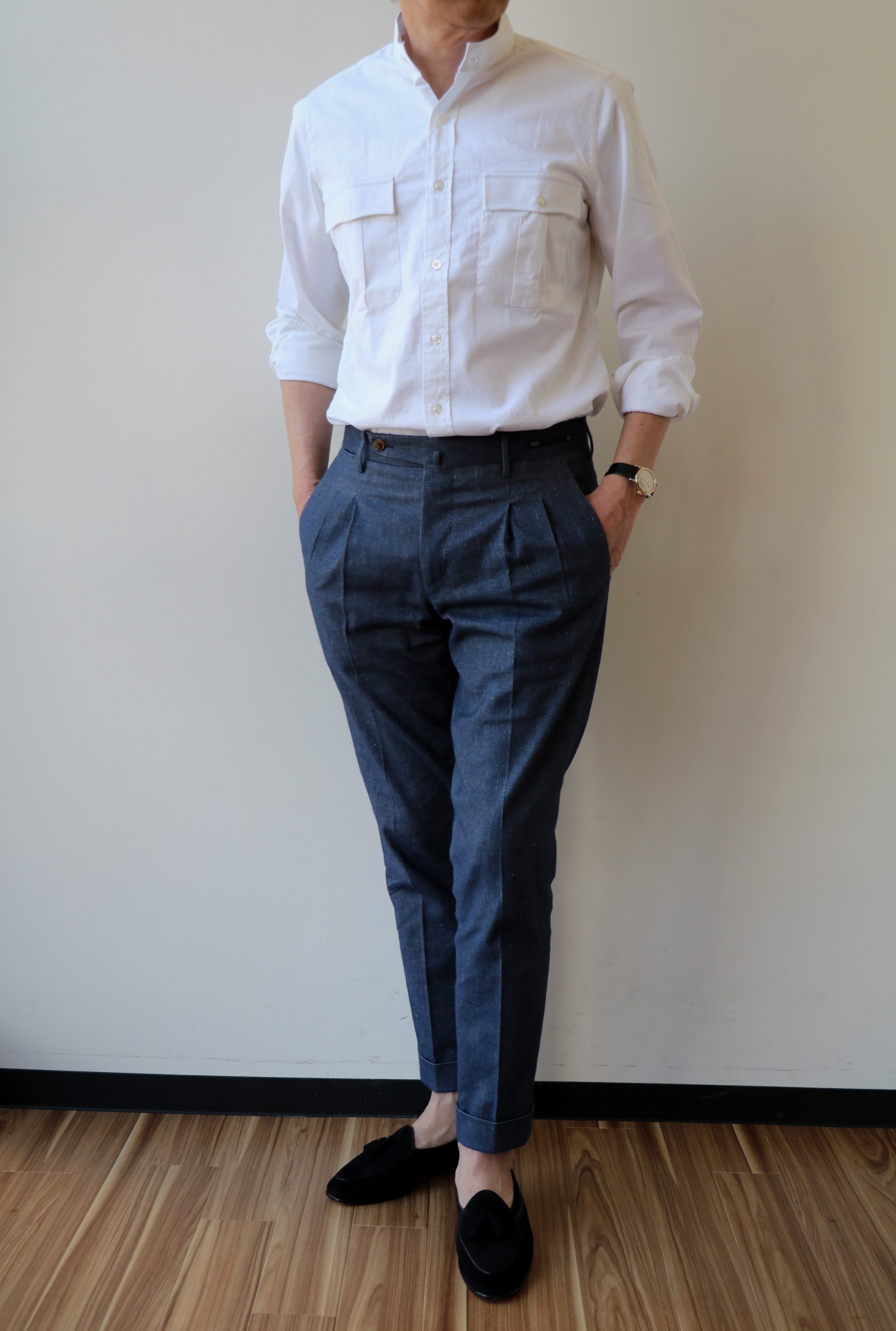 直しから戻ってきたPT01(ピーティーゼロウーノ)のパンツ。裾は、4.5cmのダブルにしました。合わせたシャツが、本日、ご案内の【Mario Muscariello/マリオ ムスカリエッロ】です。