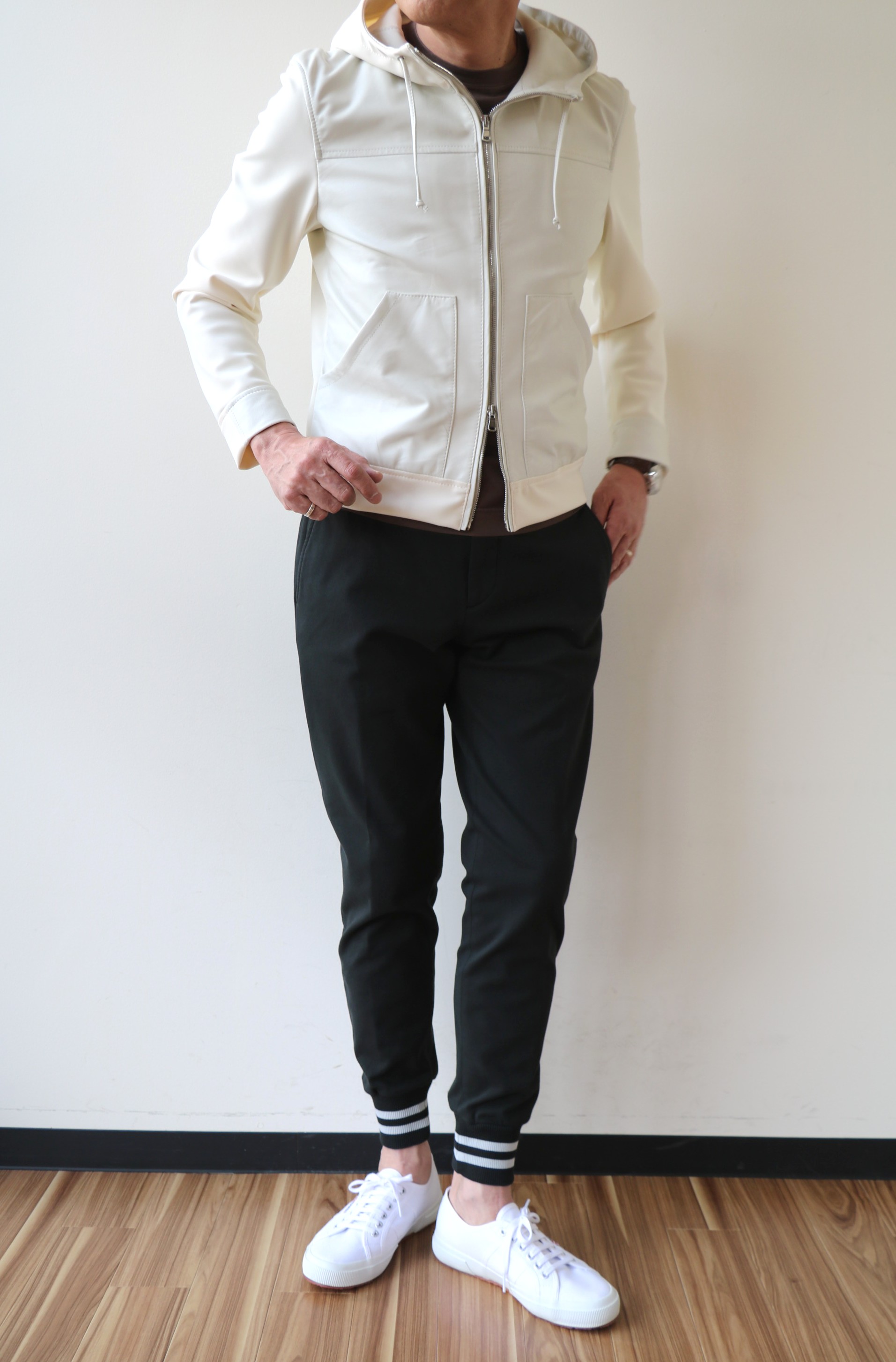 ホワイト、ブラウンの他にセレクトした瑠璃色に近い鮮やかなコバルトブルー。どれもがブラックのパンツにも合わせるとモダンです。ここで合わせたパンツは、昨日ご案内のPT01(ピーティーゼロウーノ)の「FORWARD」です。