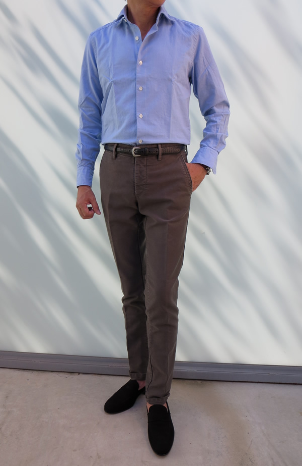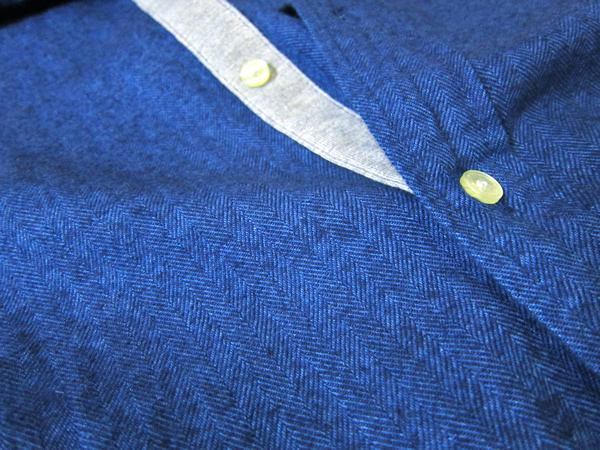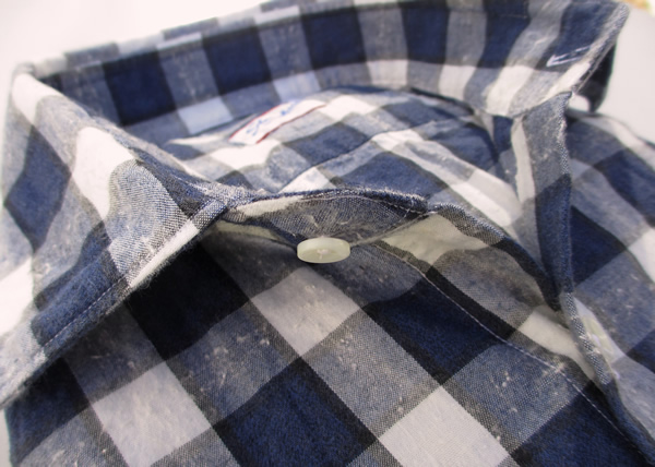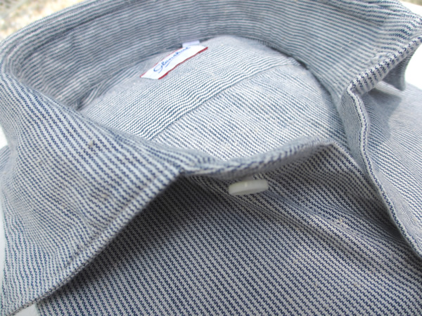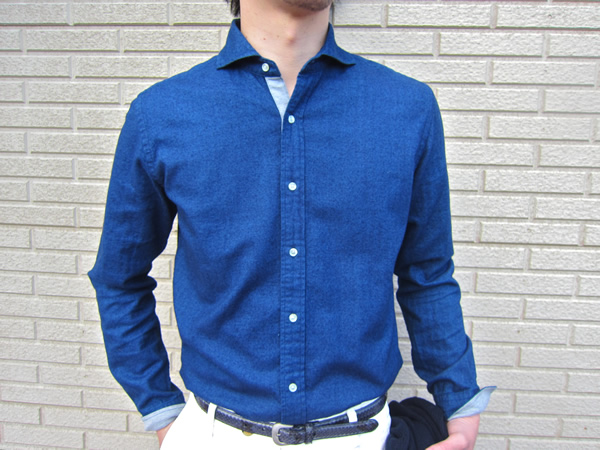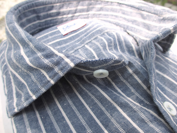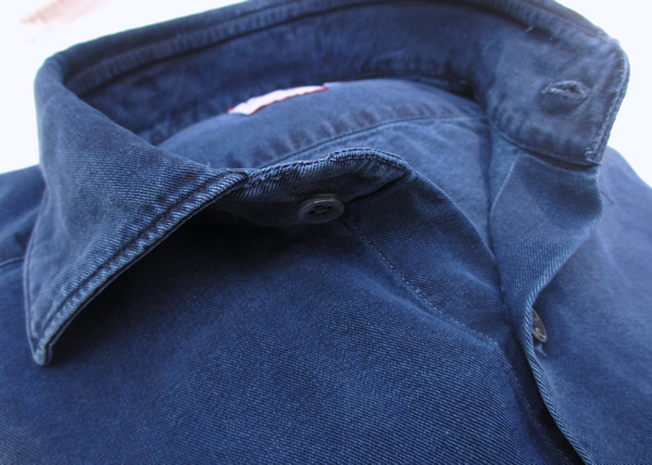 ヘリンボーンのインディゴシャツの襟型は、Finamore/フィナモレやBARBA/バルバのようなホリゾンタルワイドカラーですが、こちらのシャンブレーシャツは、やや小振りなワイドカラーです。