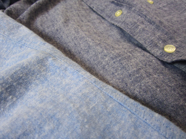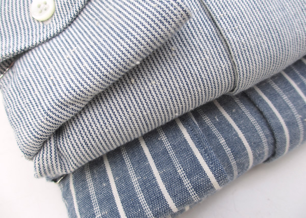 ヴィンテージブルーのストライプにネップ。こんなシャツを着て、秋晴れの空の下で、のんびりしたいですね。