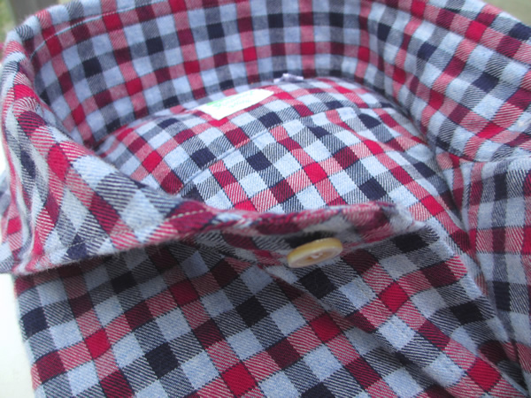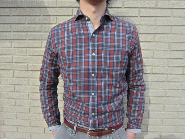 コットンにレーヨン、シルクを混ぜた人気のブロックチェック。わざと生地にダメージを与え、毛羽立たせるところは、REDの継承を窺わせます。ただ昨年までと違うのは、やり過ぎないところ。生地も薄手で、こなれ感を出しながらもエレガントで上品さのあるシャツに仕上がっています。