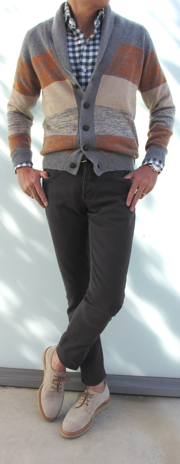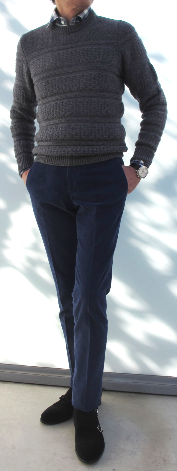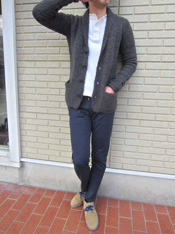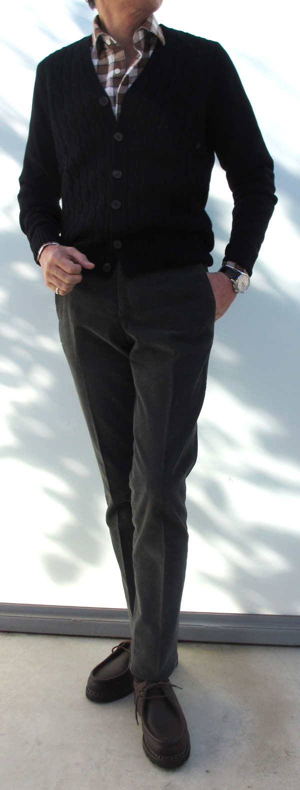 どうせなら、アウター部門のMONTEDORO(モンテドーロ)もコーディネートに入れれば良かったですね。合わせたニットは、ZANONE(ザノーネ)のジャガードクルーネックとケーブル編みカーディガン。INCOTEX(インコテックス)はストレッチコーデュロイパンツです。