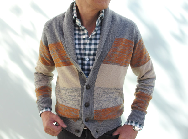カーディガンですが、襟とポケットのデザインによって、ニットジャケットのようにも見えるから不思議です。インナーにジレを合わせると良いなと、写真を撮ってから忘れていた事に気付きましたが、皆さんはぜひ実践してみてください。