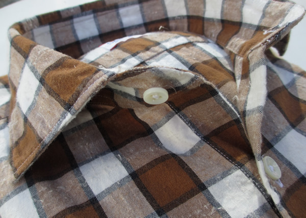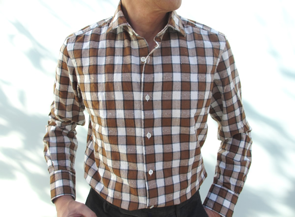上から、小柄チェック(brown plaid)とブルーベースの大柄チェック(brown tartan)は、ブラッシュドコットンのボタンダウンシャツ。下(brown plaid)は、フランネルのワイドカラーシャツです。