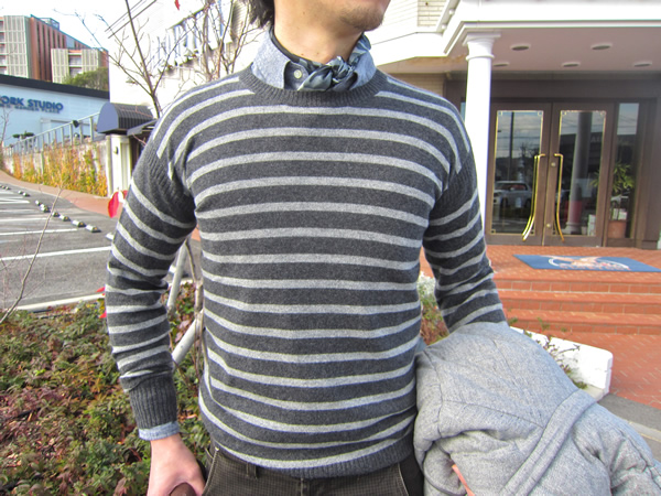 そして、贅沢にカシミア100%で編み込まれた、ボーダーのクルーネックニット。シャツにスカーフを巻いて、クルーネックニットを合わせれば、保温性の高いカシミアは、すぐに体がポカポカになります。