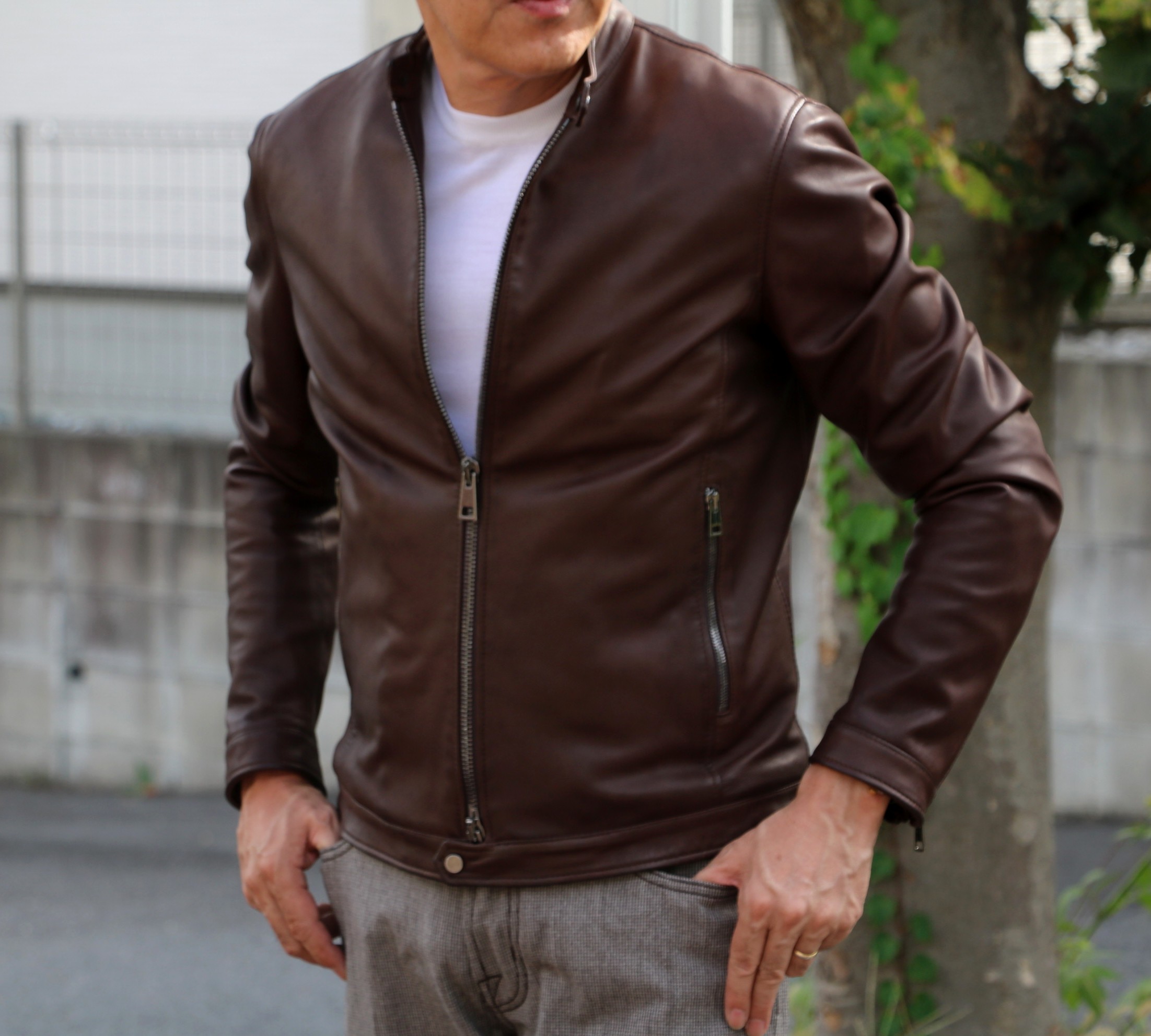 セレクトカラーは、ブラウンとネイビー。表革はシープスキン、袖裏キュプラ、裏地は中綿入りのキルティング仕様になります。中綿入りのもたつきは無く、羊革のしなやかで丸みのある表情はそのままに、保温性も十分なレザーブルゾンです。
