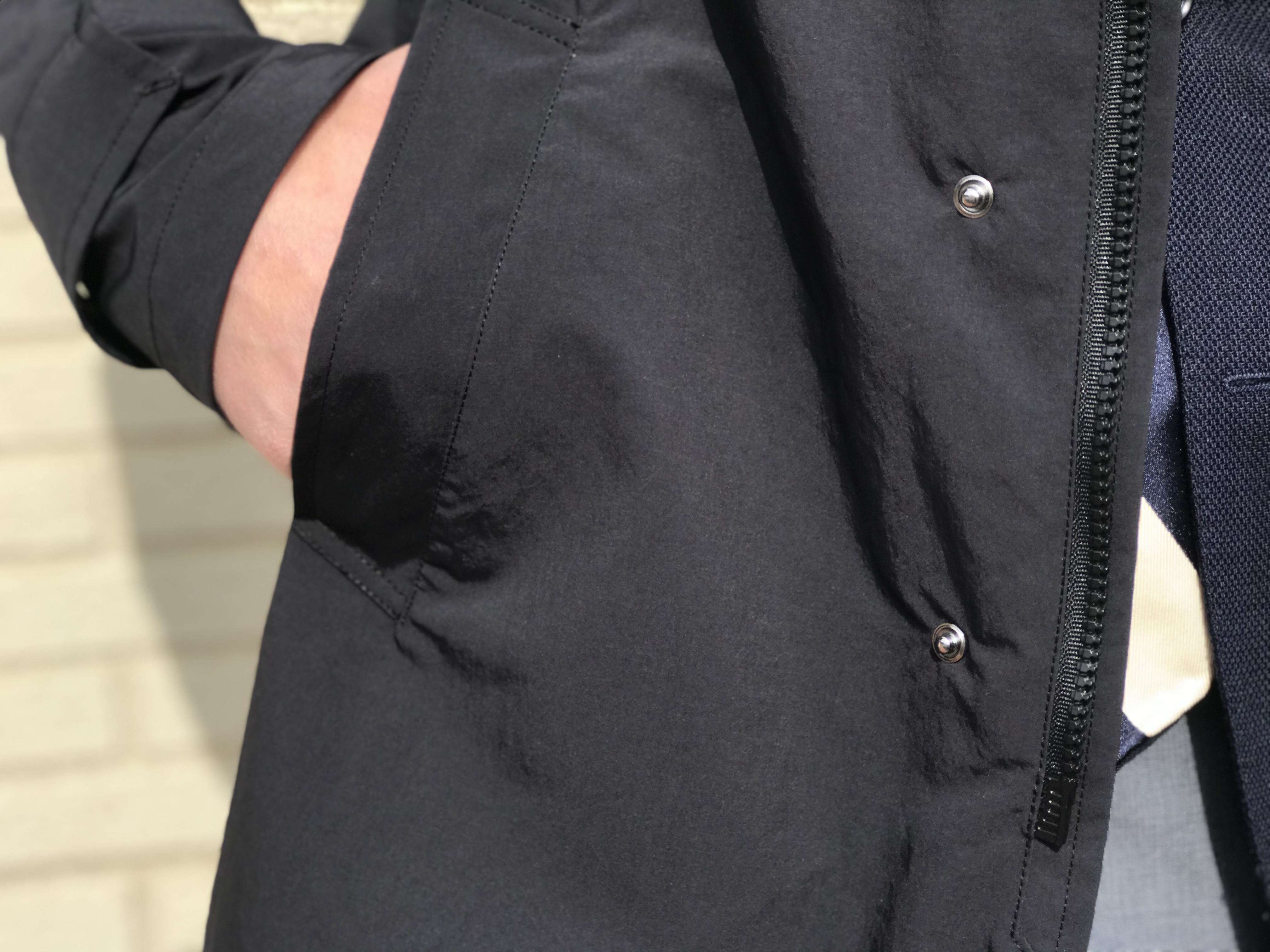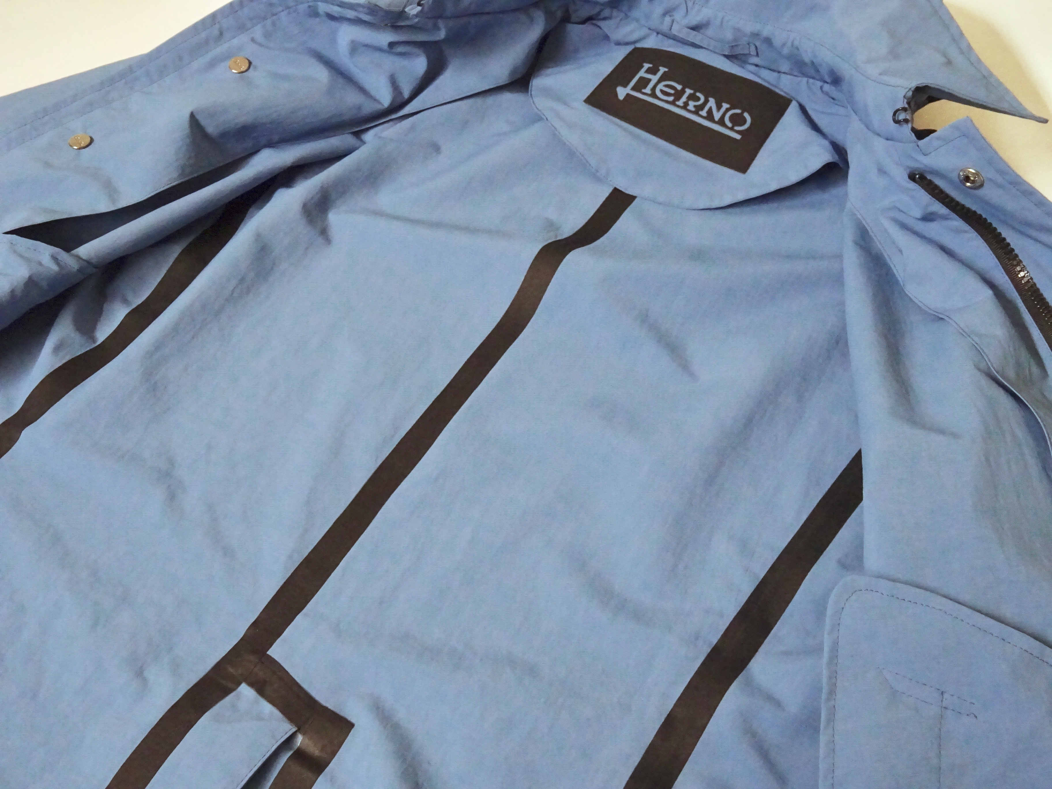 生地は、【HERNO/ヘルノ】が開発した多機能ファブリックの「HernoTECH」。タグに書かれていることを要約すると、表面生地は雨と風をシャットアウトしながら、内側にこもった湿気は発散する。コンパクトに圧縮された生地ですが、雪が降るような環境下でも内側を36℃に保つ保温性がある、とのことです。
