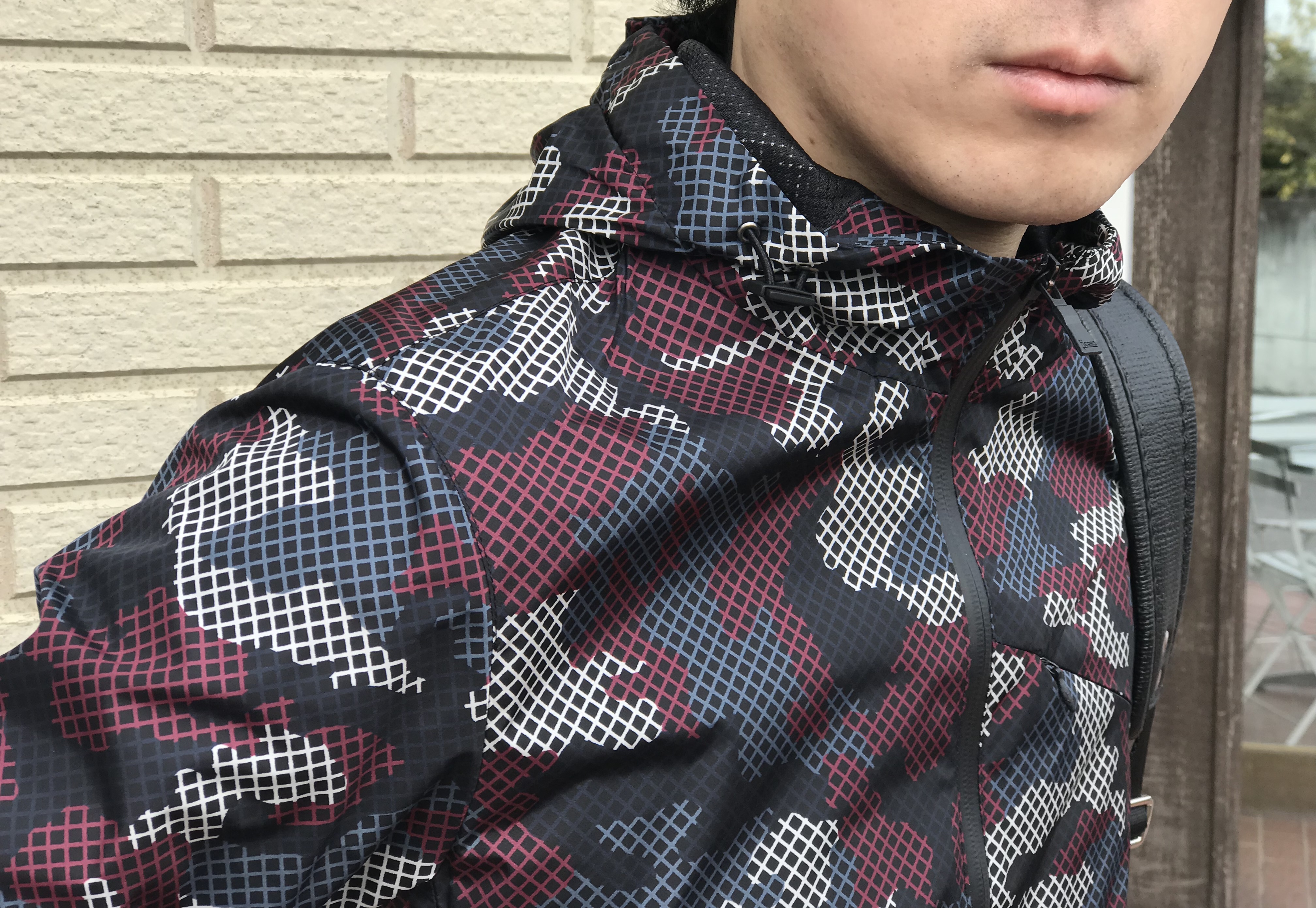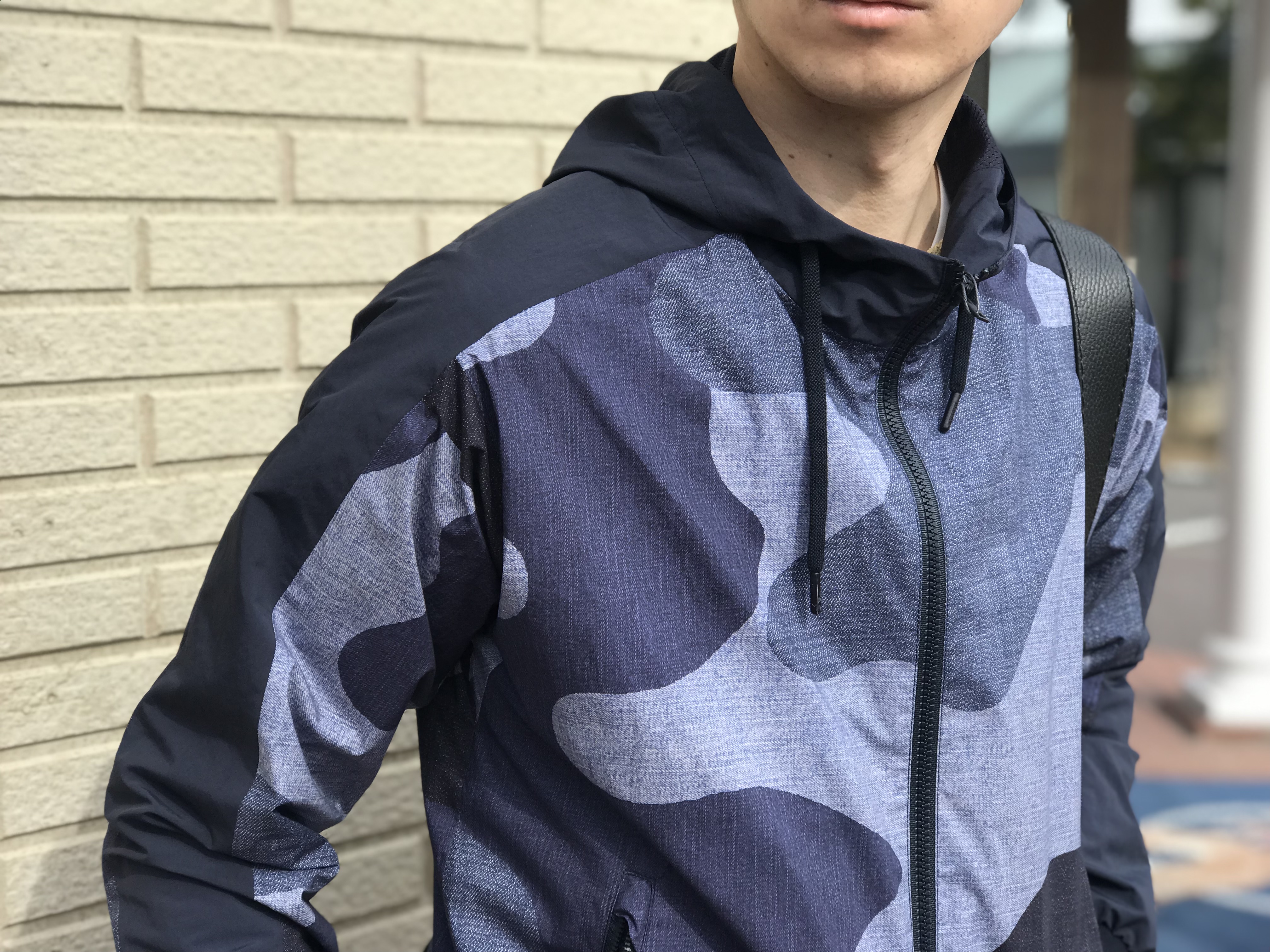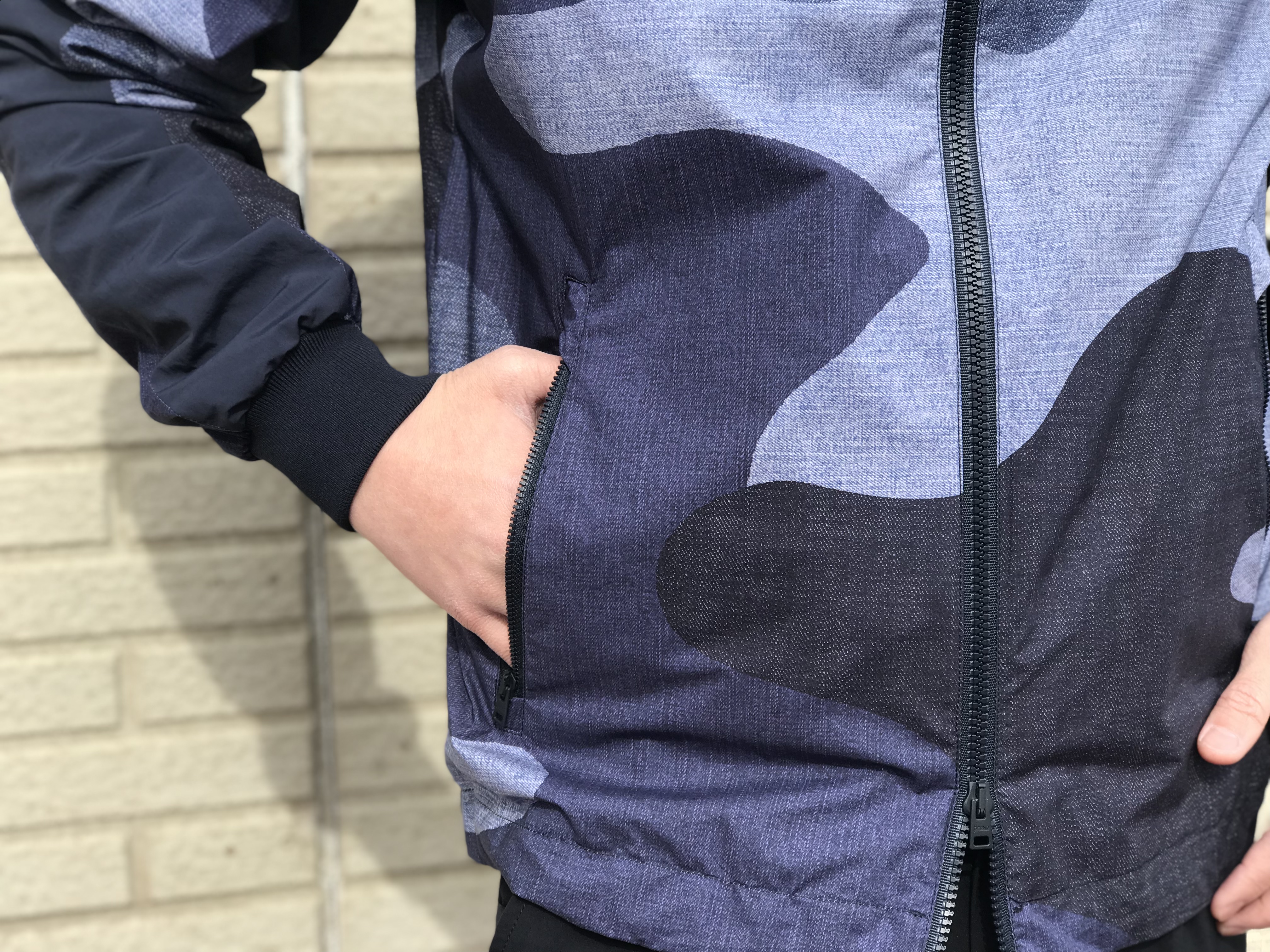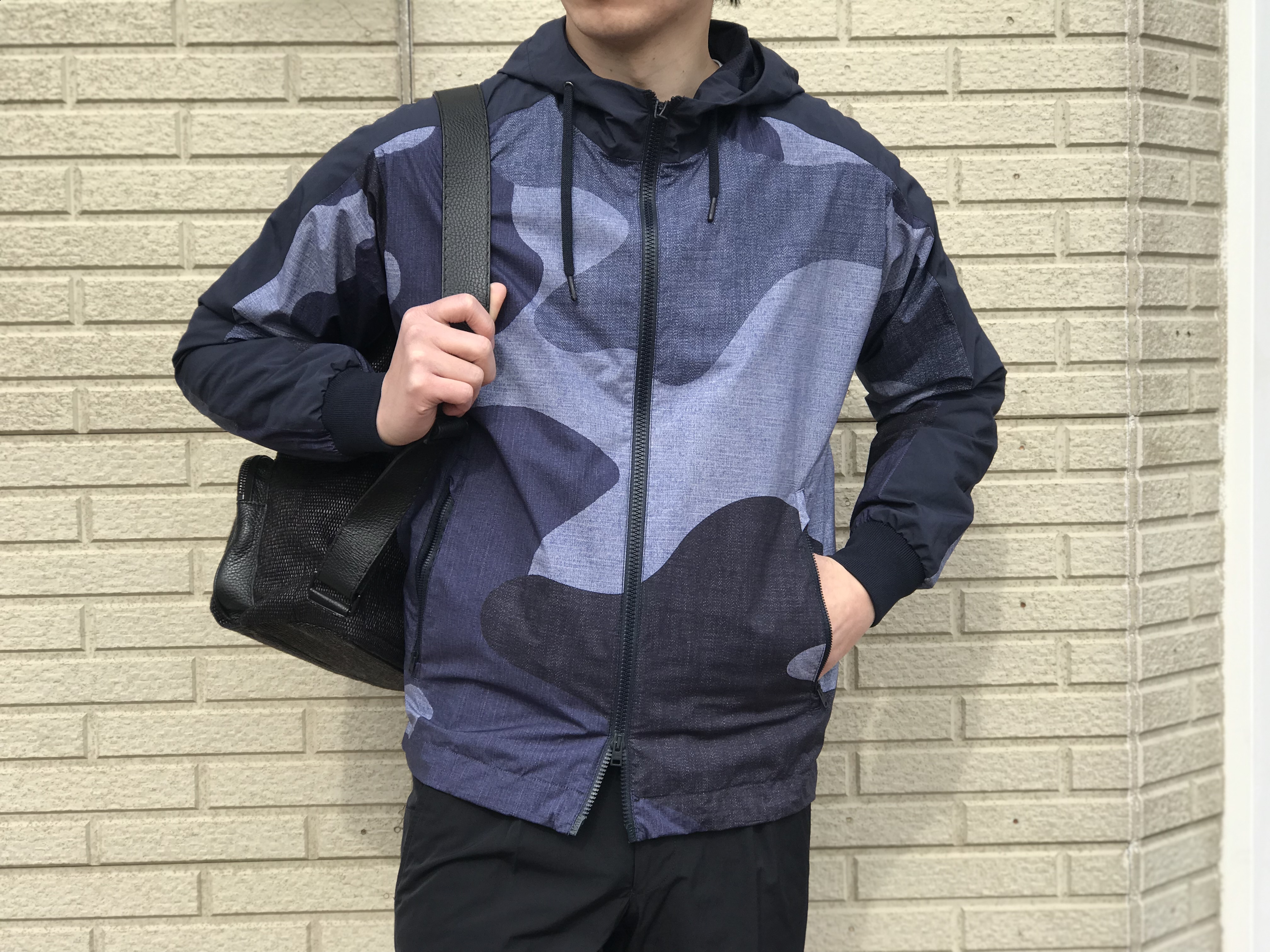 身頃はポリウレタンコーティングがされたコットン素材で、インディゴカラーでプリントされた大胆なカモフラ柄が特徴。シルエットはちょっぴりリラックス感があります。