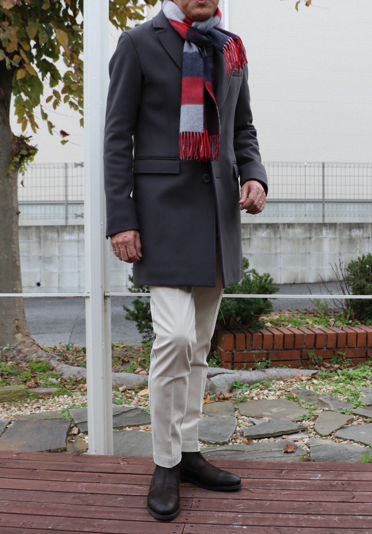 3枚目の立ちポーズ。くどいようですが、構成上、使わせて頂きました。合わせたマフラーはJOHNSTONS(ジョンストンズ)、パンツはPT01(ピーティーゼロウーノ)、靴はParaboot(パラブーツ)です。